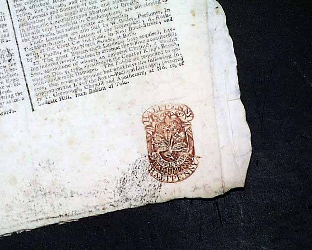 Fourt pages, never bound nor trimmed, red tax stamp at the bottom margin, very nice condition.