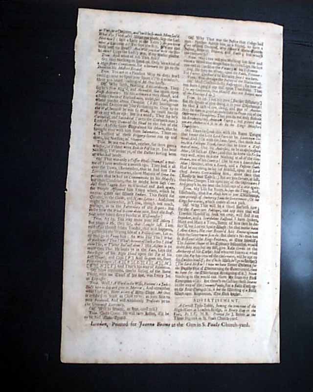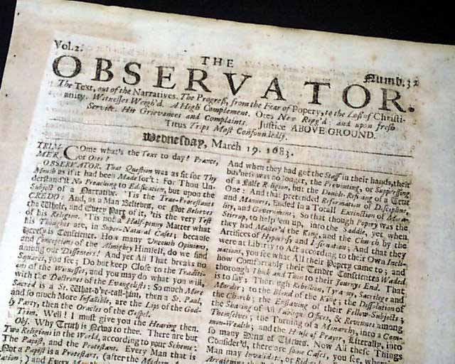 THE OBSERVATOR, London, March 19, 1683 This is a handsome dialogue newspaper founded by Sir Roger L'Estrange, a Tory pamphleteer, as a vehicle for attacking dissenters and Whigs. Done in a dialogue format, between Whig & Tory. This early single sheet newspaper has the old style type making it great for framing, but the most intriguing aspect of this issue is that the imprint at the bottom of the back page reads: "London, Printed for Joanna Brome, at the Gun in S. Paul's Church-yard."