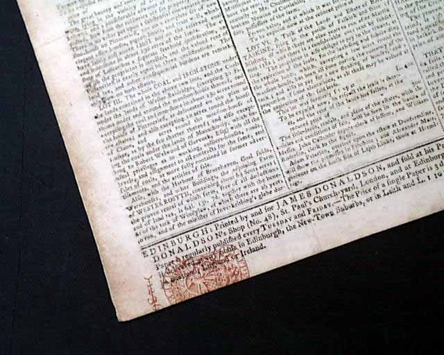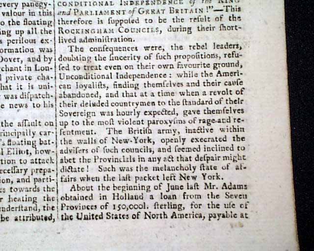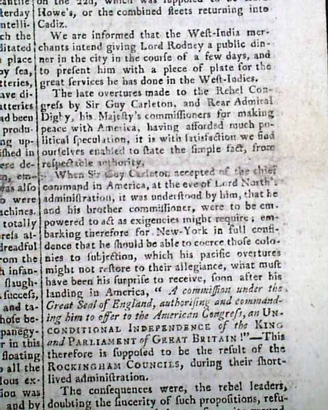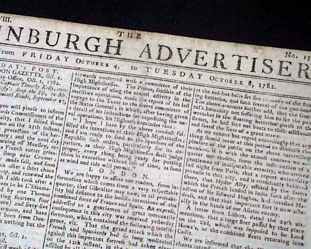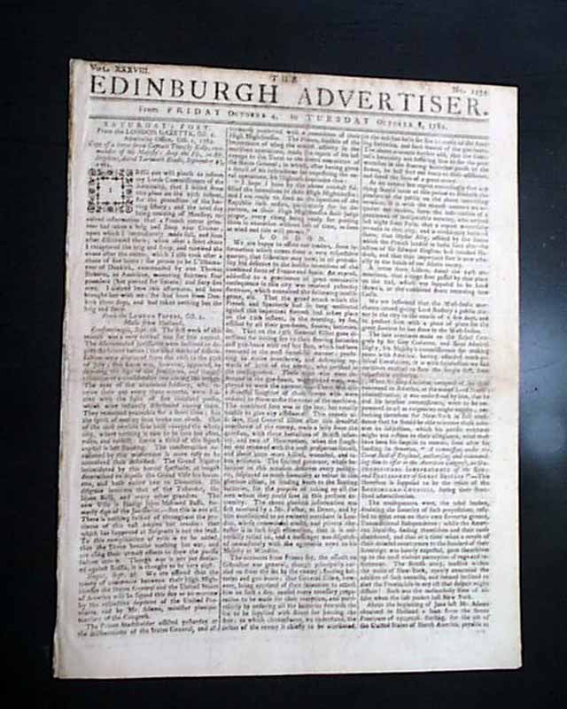 THE EDINBURGH ADVERTISER, Scotland, Oct. 8, 1782  The front page has a report with bits including: "...The late overtures made to the Rebel Congress by Sir Guy Carlton...for making peace with America, having afforded much political speculation, it is with satisfaction we find ourselves enabled to state the simple fact, from respectable authority. When Sir Guy Carleton accepted of the chief command in America...it was understood by him that he & his brother commissioners, were to be empowered to act as exigencies might require; embarking therefore for New York in full confidence that he should be able to coerce those colonies to objection, which his pacific overtures might not restore to their allegiance, what must have been his surprise to receive, soon after his landing in America, 'A commission...authorizing & commanding him to offer to the American Congress an Unconditional Independence of the King and Parliament of Great Britain!'..." with more.