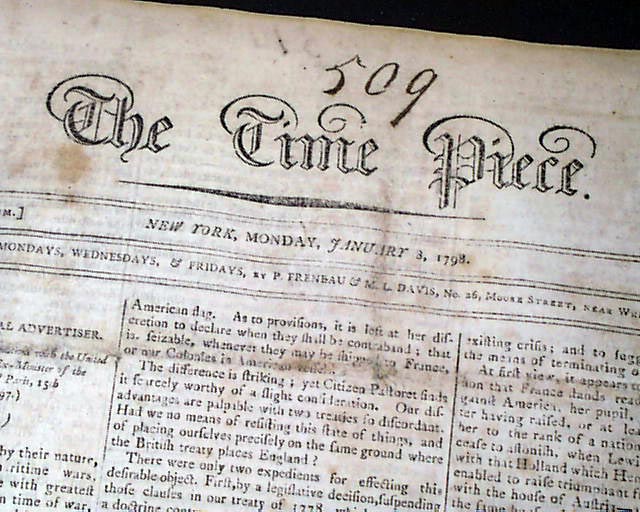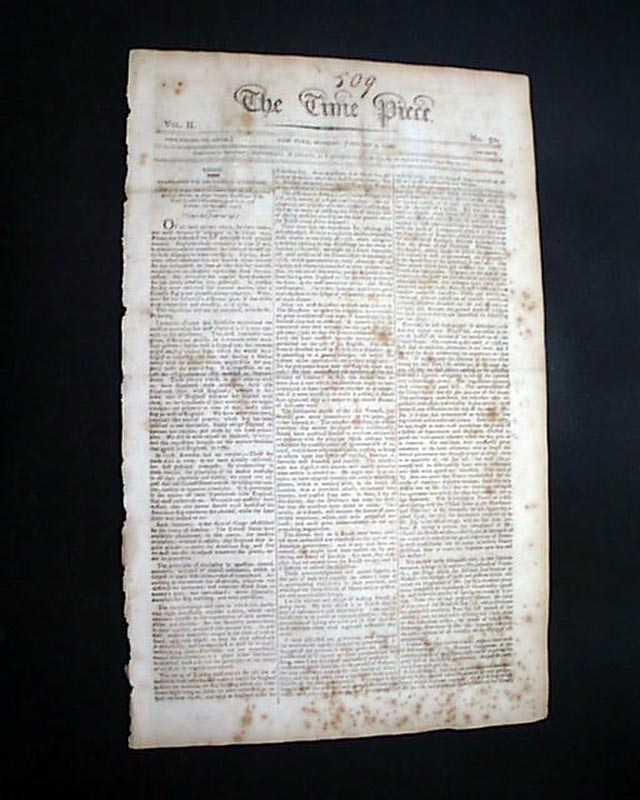 AI notes: Philip Freneau, the Revolutionary-era poet and staunch Jeffersonian, launched a New York newspaper titled the Time Piece in 1797 as a partisan Democratic-Republican organ aimed at countering the city’s dominant Federalist press. Building on his earlier experience editing the National Gazette in Philadelphia, Freneau filled the Time Piece with sharp political essays, satirical verse, and cultural commentary that denounced Alexander Hamilton, John Adams, and the Federalist agenda while promoting Jeffersonian republicanism and popular liberty. His editorial style blended polemic and poetry, earning him a reputation as both a propagandist and a literary figure, but the paper struggled financially in New York’s crowded newspaper market and ceased publication after only a brief run. Though overshadowed by larger papers of the era, Freneau’s Time Piece is remembered as part of his ongoing effort to use journalism as a weapon in the fierce ideological battles of the 1790s.