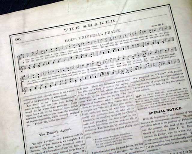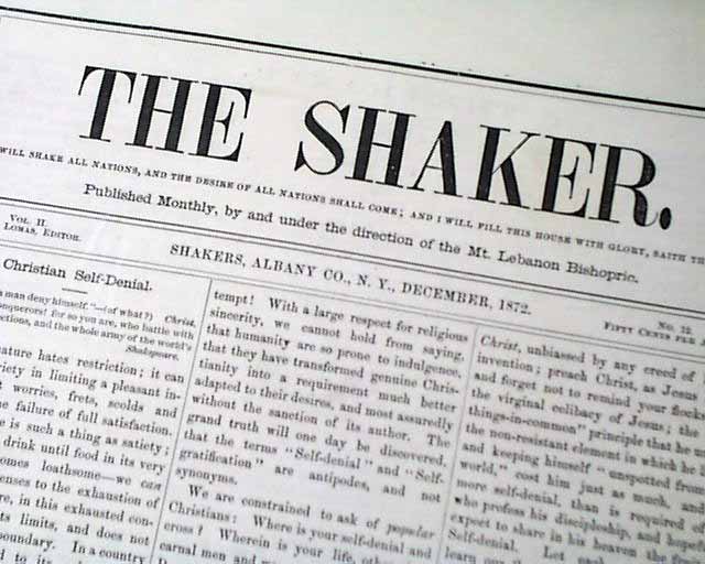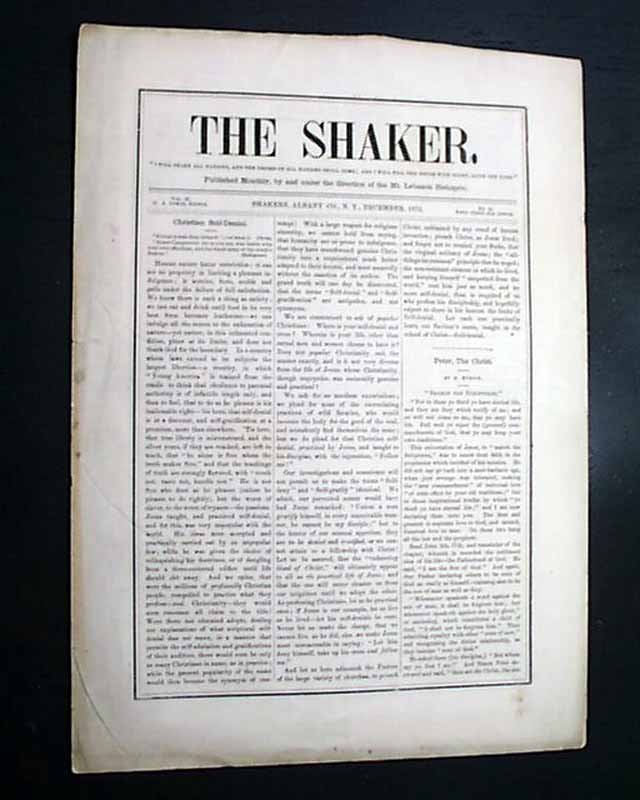 Item # 707253 THE SHAKER, Shakers, Albany County, New York, December, 1872 This title is: "Published Monthly, by and Under the Direction of the Mt. Lebanon Bishopric" as noted in the masthead. It is for those in the Shaker community, quite famous today for the style of furniture they produced.