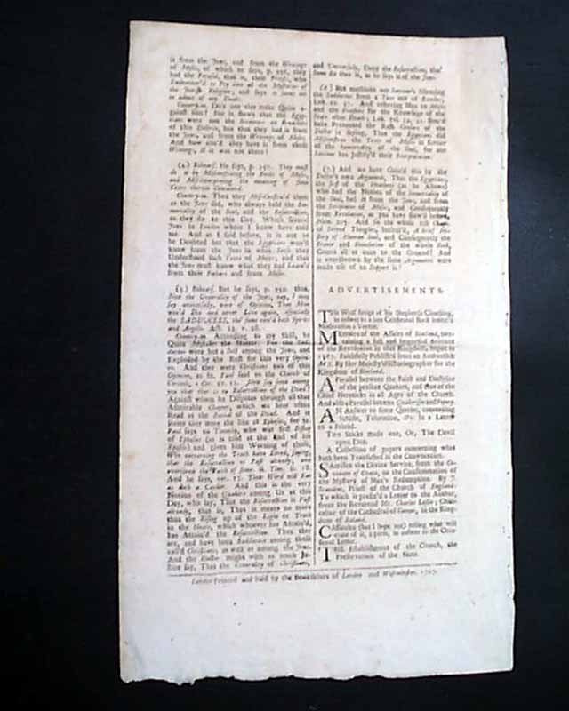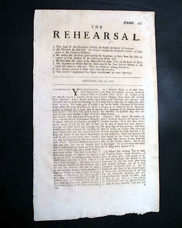 THE REHEARSAL, London, June 28, 1707  A fine single sheet newspaper which lasted only 6 years. It was published by Charles Leslie, considered a violent controversialist who was virtually inextinguishable. Another source notes: "...in August 1704, he had started, in opposition to the ‘Observator’ and Defoe's ‘Review,’ a periodical entitled ‘The Rehearsal.’ It was published...beginning with 10 April 1706. The title was borrowed from the well-known play by the Duke of Buckingham. In form ‘The Rehearsal’ was a lively dialogue between Rehearsal and Observator or Countryman, and, though largely occupied with matters of merely ephemeral interest, afforded Leslie scope for a familiar exposition of his views on serious matters....".
