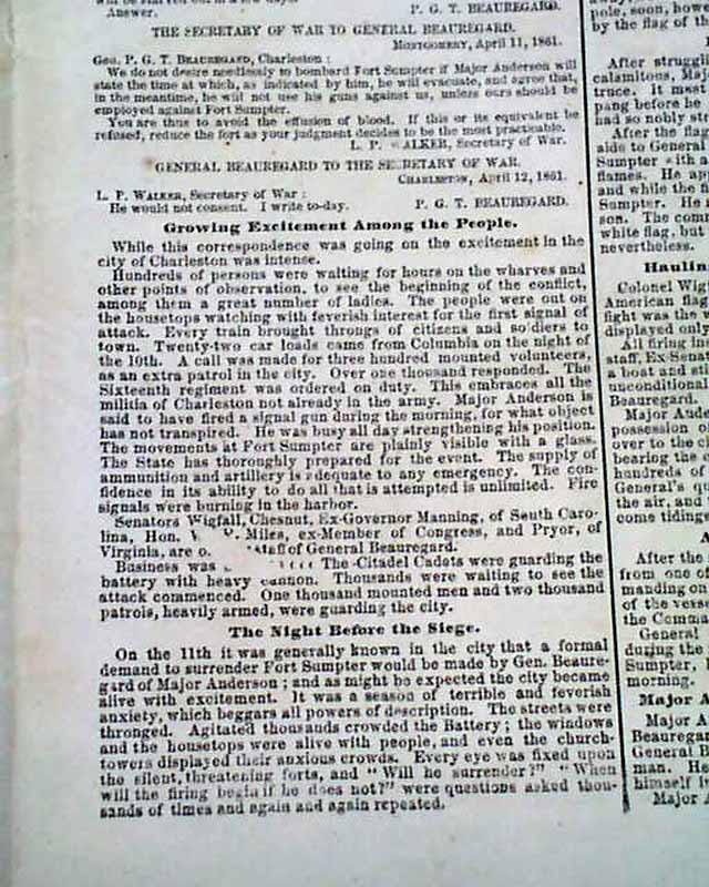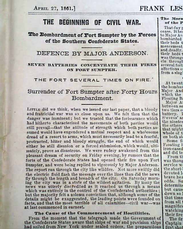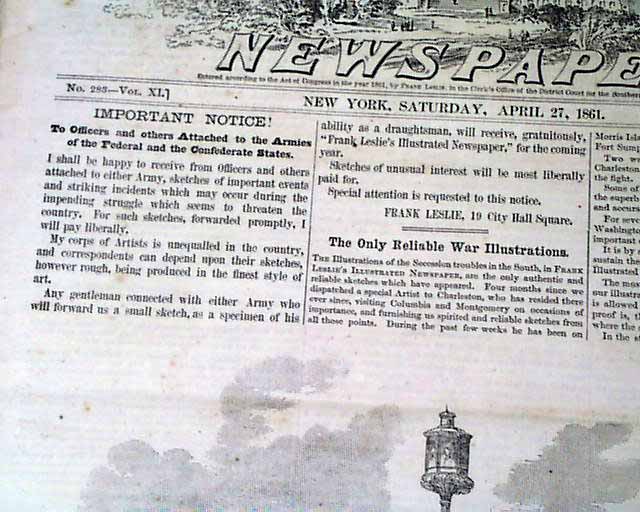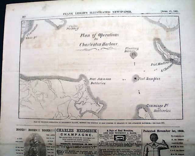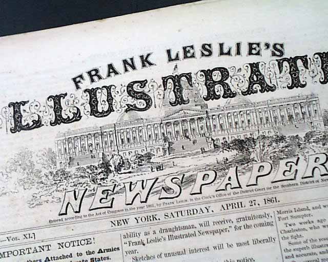 FRANK LESLIE'S ILLUSTRATED, New York, April 27, 1861 The front page features a large print: "Excitement on the Battery at Charleston, S.C., During the Bombardment of Fort Sumter".