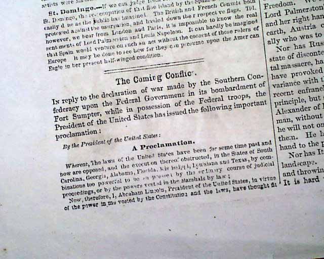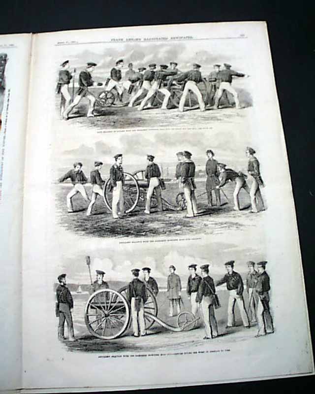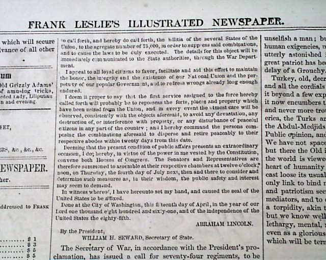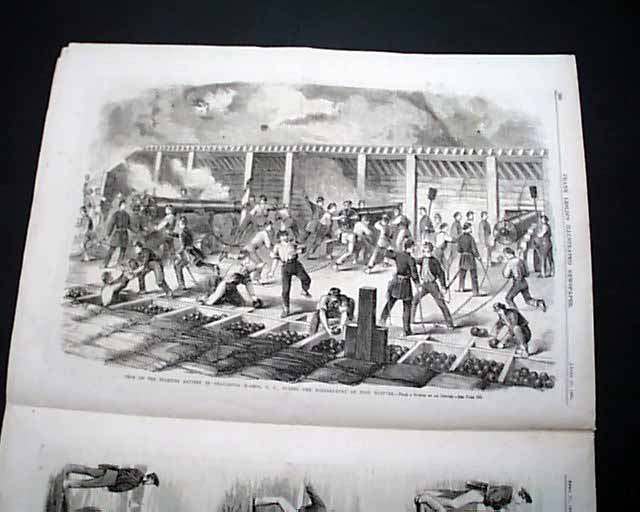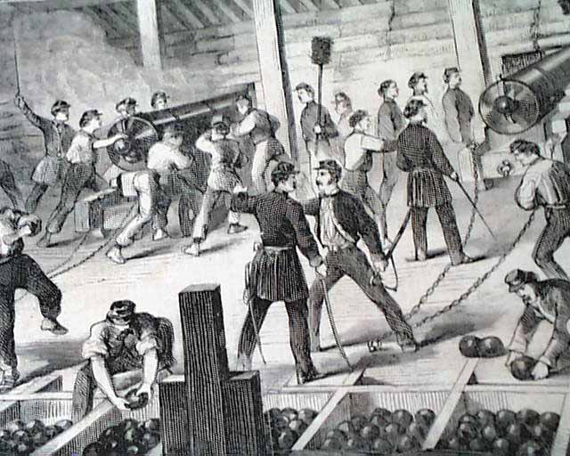 Inside is the Proclamation signed in type: Abraham Lincoln for the calling of the Federal troops. A full page is comprised of three illustrations on using the Dahlgren Howitzer gun. Another full page is the: "Scene on the Floating Battery in Charleston Harbor, S.C. During the Bombardment of Fort Sumter". The back page features a half-page "Plan of Operations in Charleston Harbor".