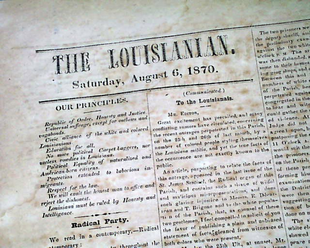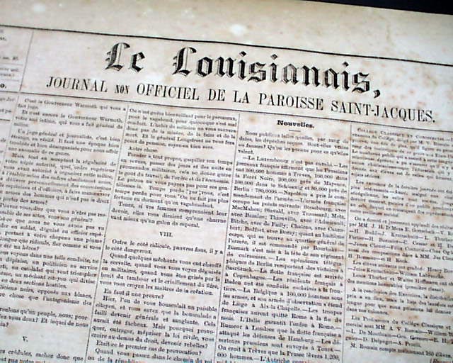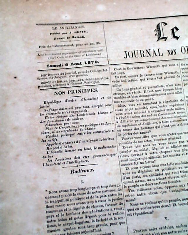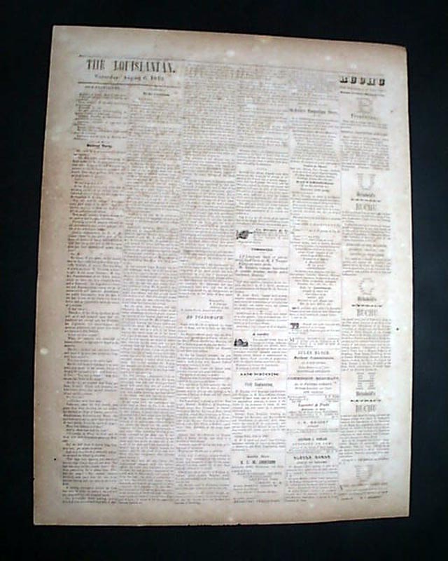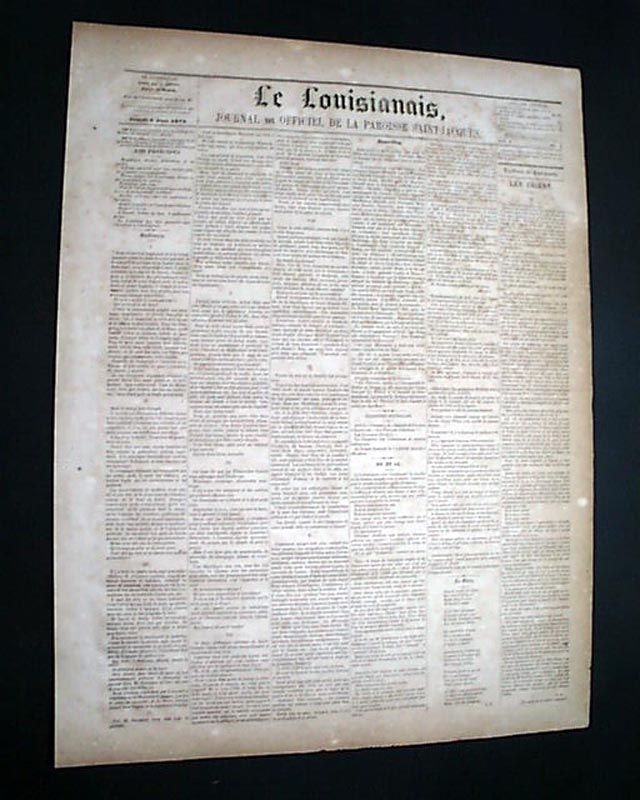 LE LOUISIANAIS, Convent, Louisiana, Aug. 6, 1870  A scarce title which existed from 1865 thru 1883, but of which very few issues surface. It is a single sheet newspaper with the front entirely in French while the reverse is in English save for the advertisements, most being in French.