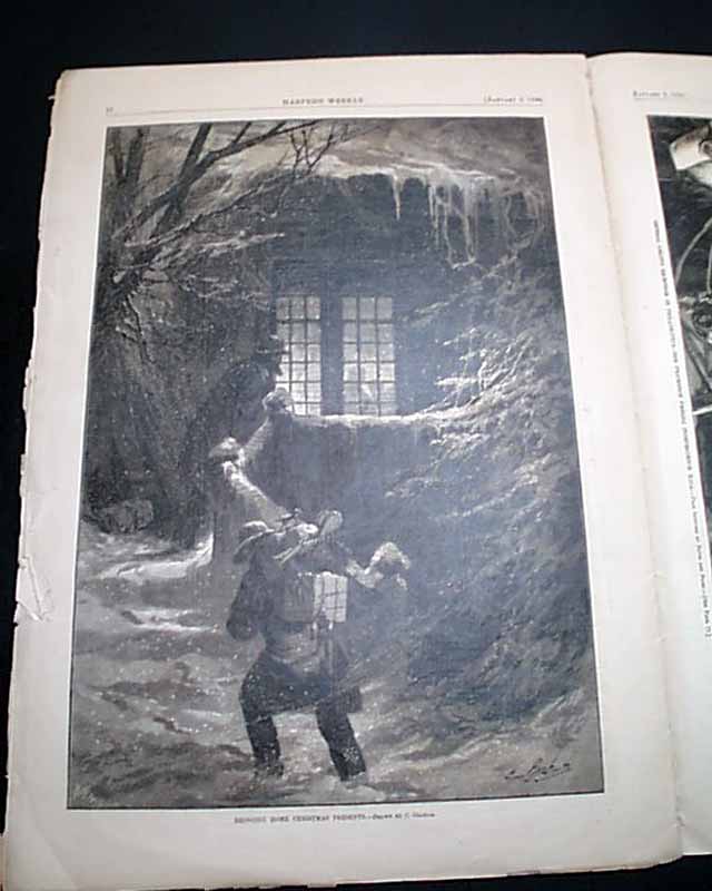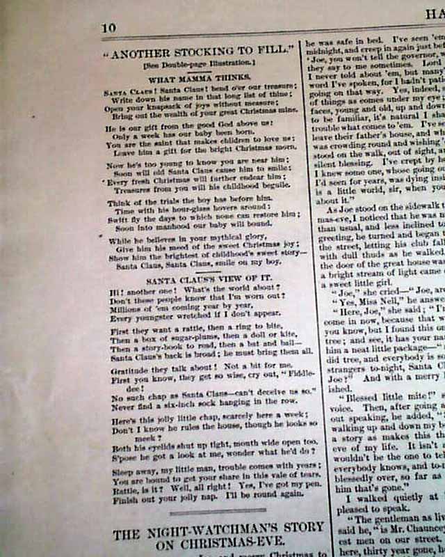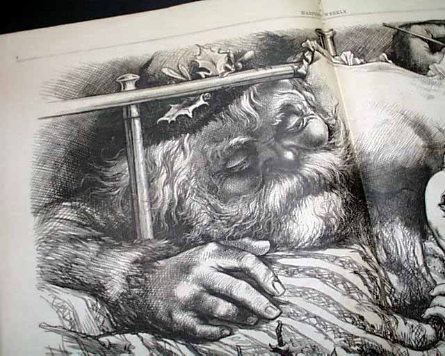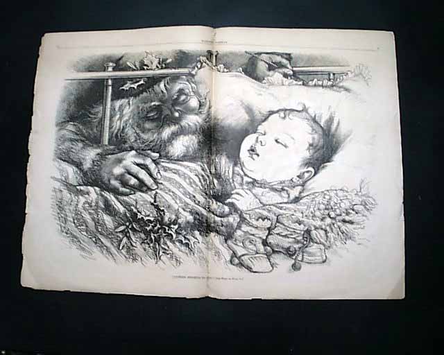 The doublepage centerfold is a very nice Thomas Nast Christmas print captioned: "Another Stocking to Fill" showing Santa Claus leaning over a sleeping baby. A full page shows: "Bringing Home Christmas Presents".