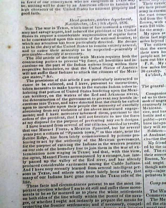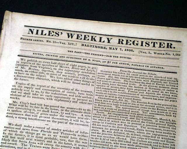 NILES' WEEKLY REGISTER, Baltimore, May 7, 1836  The front page & page 2 have an article headed: "The Mexican Borders"  and includes a letter beginning: "The war in Texas...had induced the president of the United States to require a considerable augmentation of regular force to be concentrated upon this section of the national frontier..." with much more.