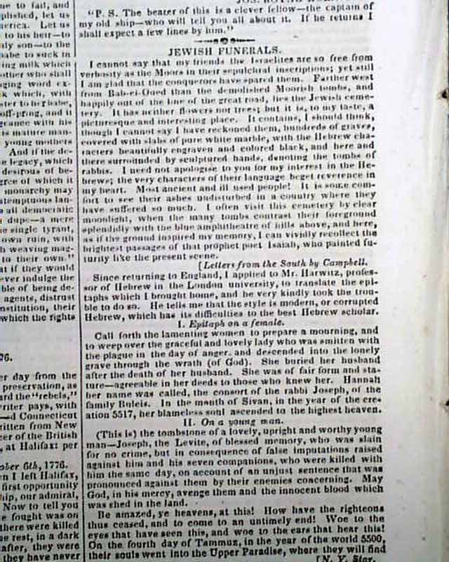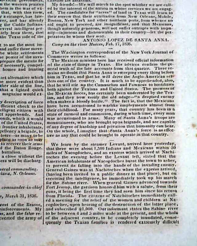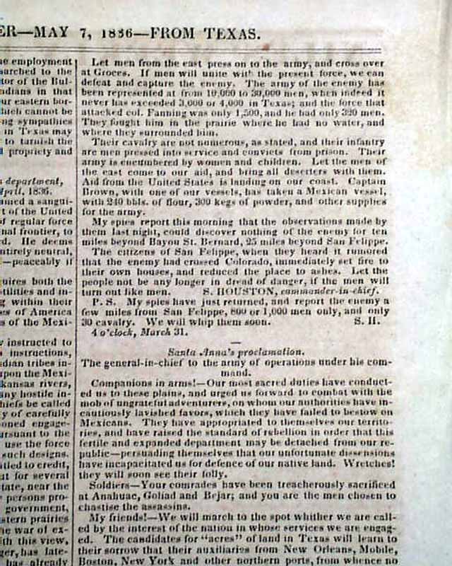 Page 2 has over half a page headed: "From Texas" which includes a letter: "...from Samuel Houston, commander-in-chief of  the Texian army." signed by him  in type: S.H., which begins: "My encampment is preparing on the west of the Brasos where I shall wait for some supplies & reinforcements..."   Also included is: "Santa Anna's Proclamation" which begins: "Companions in arms!  Our most sacred duties have conducted us to these plains, and urged us forward to combat with the mob of ungrateful adventurers..." signed in type: Antonio Lopez De Santa Anna. More Texas-related content on the same page as well.