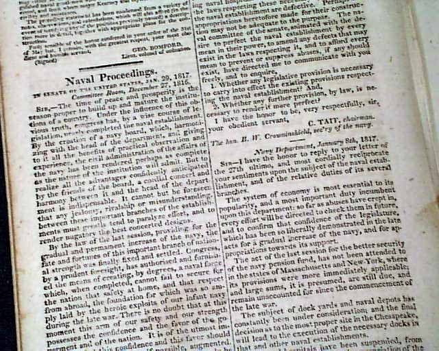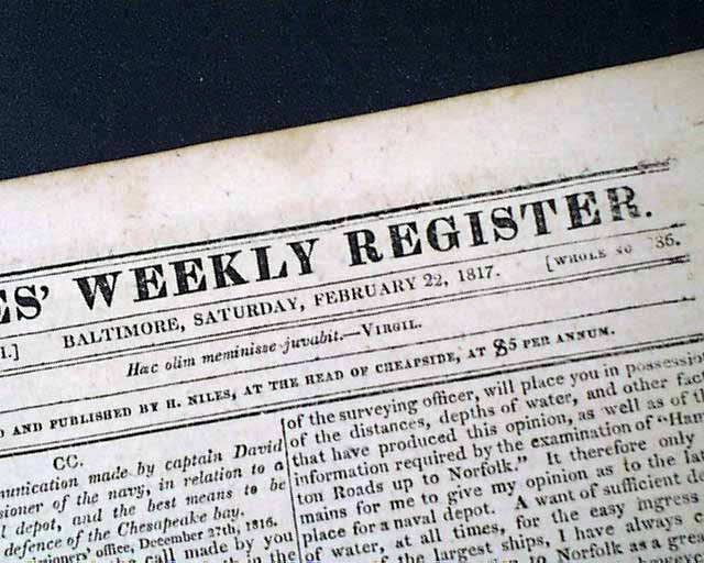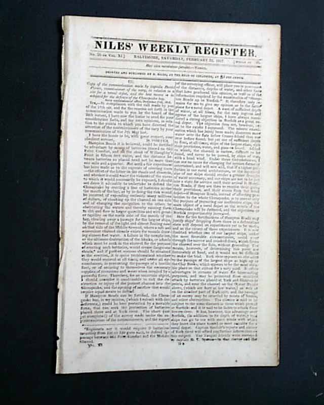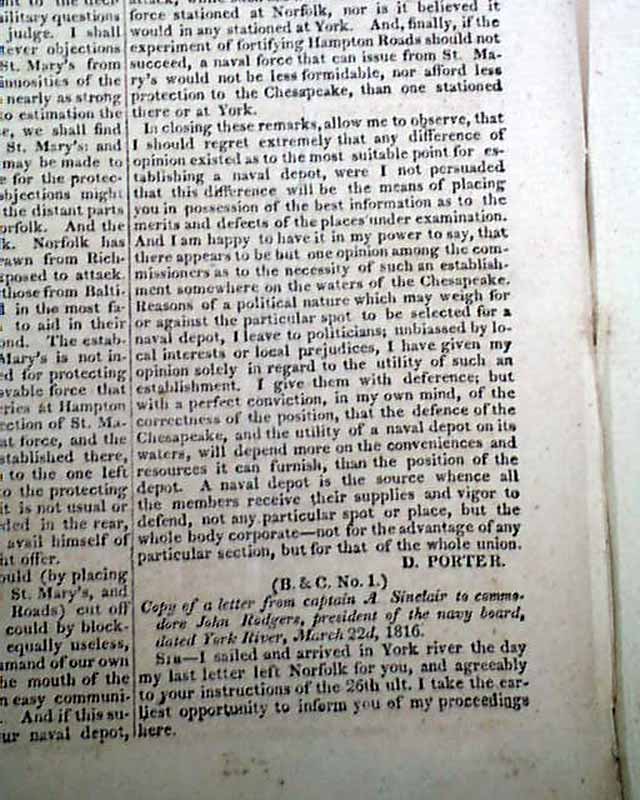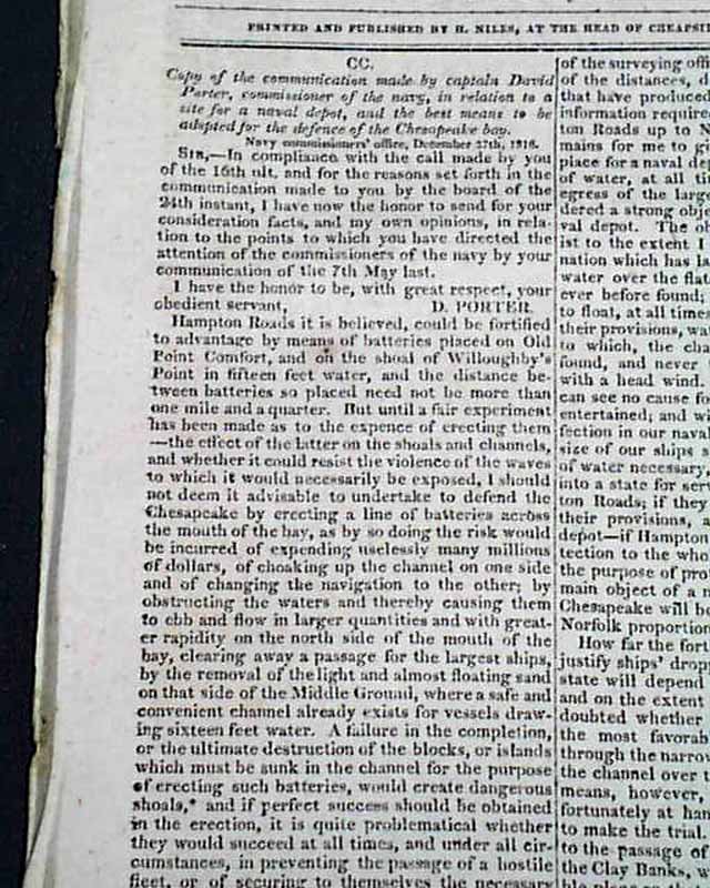NILES' WEEKLY REGISTER, Baltimore, Feb. 22, 1817 The first two pages are taken up with a lengthy report signed in type by: D. Porter, being: "...the communication made by captain David Porter, commissioner of the navy in relation to the site for a naval depot & the best means to be adopted for the defence of the Chesapeake bay." The report begins: "Hampton Roads, it is believed, could be fortified to advantage by means of batteries placed on Old Point Comford & on the shoal of Willoughby's Point..." with much more.