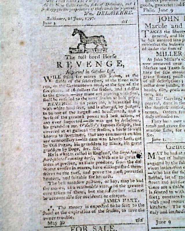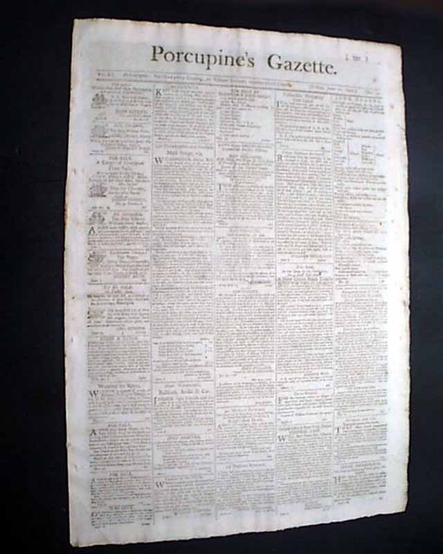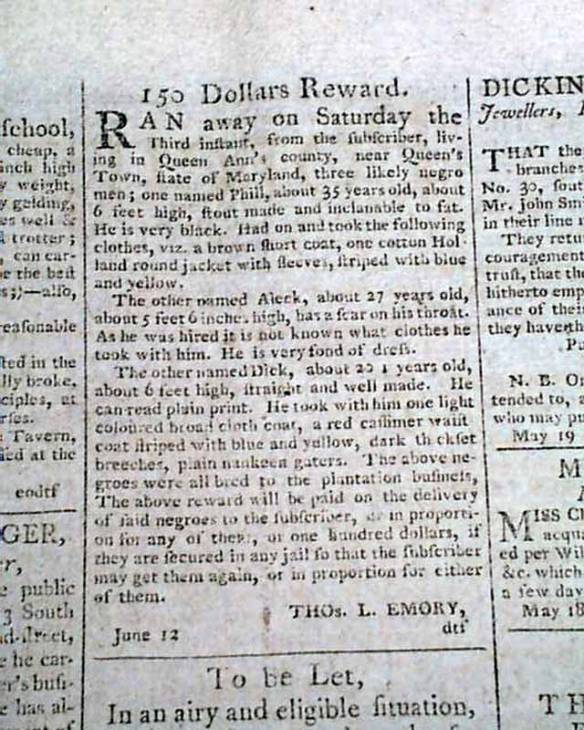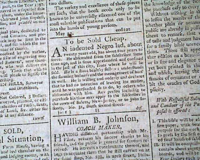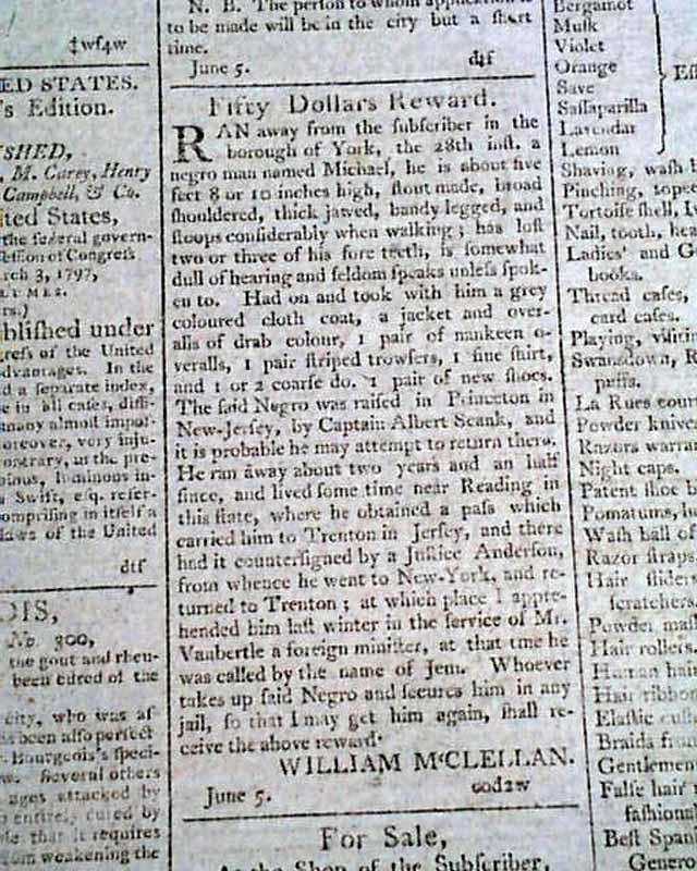 PORCUPINE'S GAZETTE, Philadelphia, June 16, 1797 The entire front page is taken up with ads. The front page has a runaway slave ad under: "Fifty Dollars Reward" with much detail. Another on the back page, as well as one: "To Be Sold Cheap--An indented Negro lad, about 20 years old..." with details.