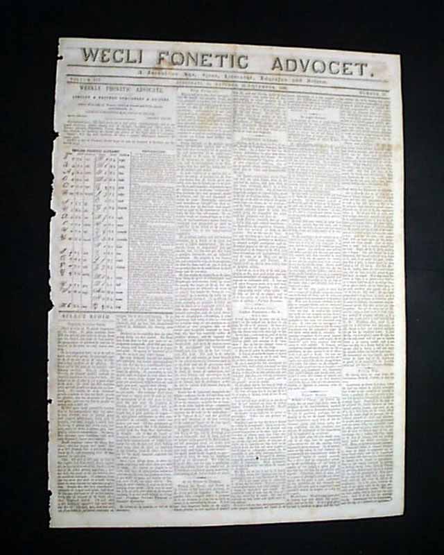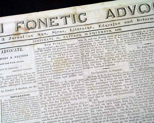 WECLI FONETIC ADVOCET, Sinsinati, O., Novembur 23, 1850 [Weekly Phonetic Advocate, Cincinnati, Ohio] This is one of the more curious newspapers of the 19th century.