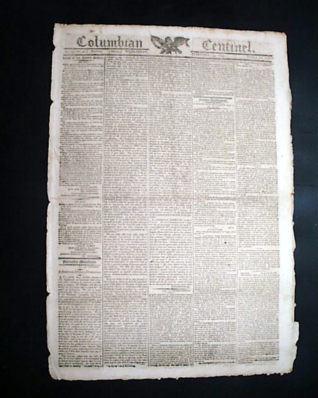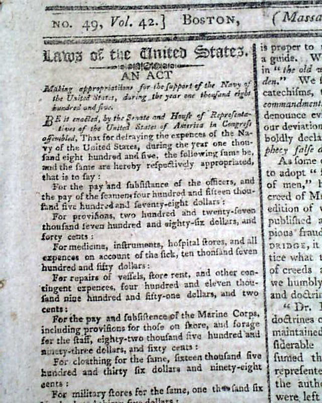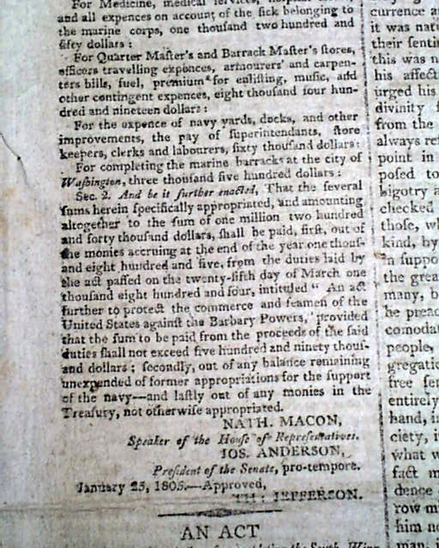 COLUMBIAN CENTINEL, Boston, Feb. 13, 1805  The front page begins with: "An Act Making appropriations for the support of the Navy of the United States, during the year 1805" plus: "An Act Making an appropriation for completing the South Wing of the Capitol...", each signed in type: TH: Jefferson.