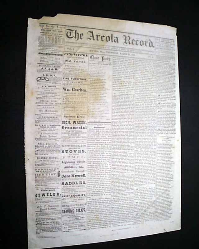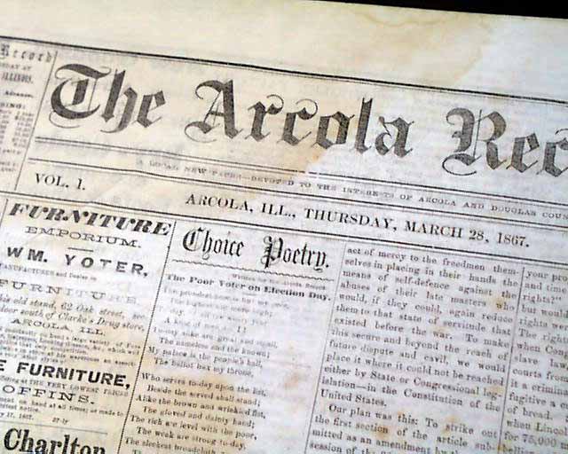 THE ARCOLA RECORD, Illinois, March 28, 1867 This is the volume 1 issue of a very scarce newspaper, as Gregory (Union List of American Newspapers) lists only two institutions having just a single issue each (1876 and 1883) and another institution having only issues dated after October, 1914.