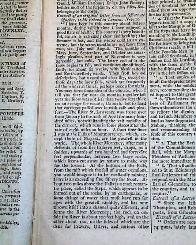 Page 5 has a great letter from Quebec in which the writer describes the city and vicinity. Page 2 has a paragraph concerning Captain Asgill noting: "...the fellow who guarded him in his prison beat him because he complained of his servant having been ill treated...", on the controversial Huddy/Asgill Affair.