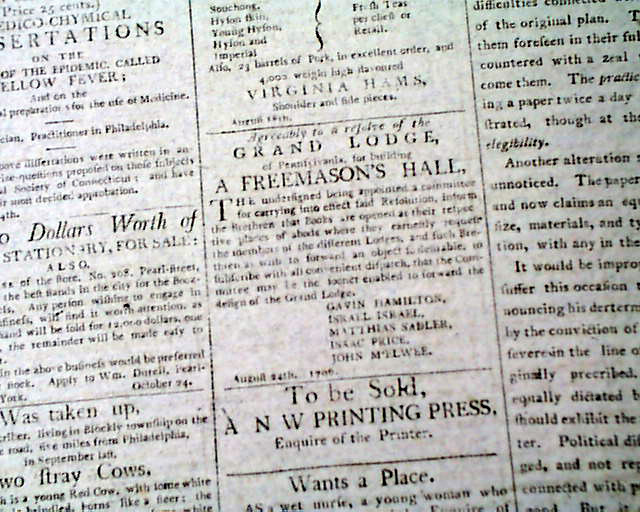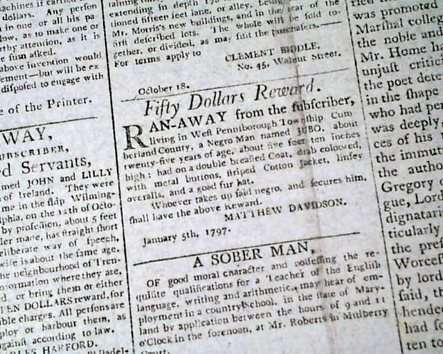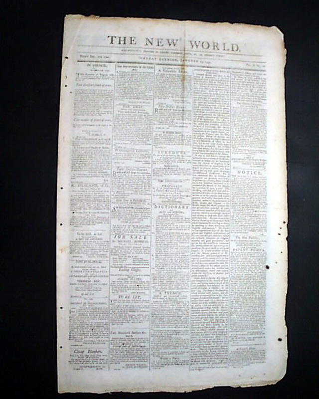 THE NEW WORLD, Philadelphia, Jan. 24, 1797  A quite scarce title, and until a recent find, the very first we have offered in our 44 years. It published for exactly one year. Various news reports and advertisements of the day.