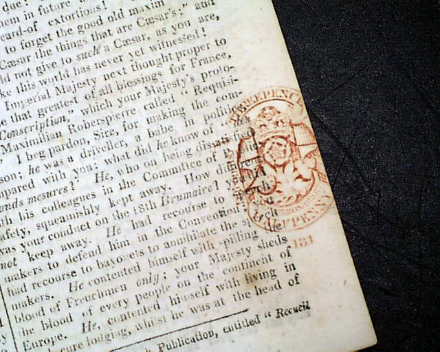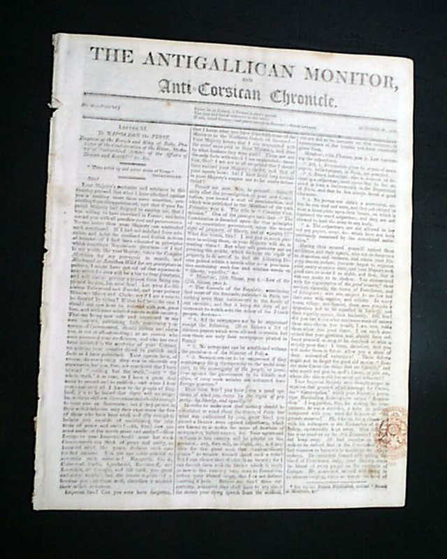 THE ANTIGALLICAN MONITOR & ANTI-CORSICAN CHRONICLE, London, Oct. 27, 1811 Published by Lewis Goldsmith, of Portuguese-Jewish extraction. Previous to publishing this newspaper he spent much time in France acting as a "secret agent" to Napoleon, including efforts to kidnap King Louis XVIII. Goldsmith escaped to England in 1809 & by 1811 he founded this newspaper (subsequently known as the British Monitor, which advocated tyrannicide) through which he denounced the French Revolution.