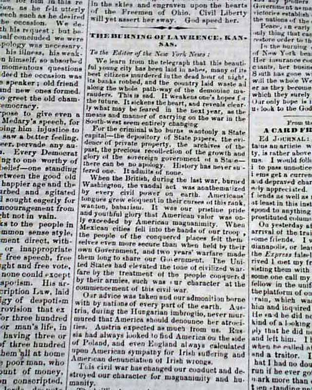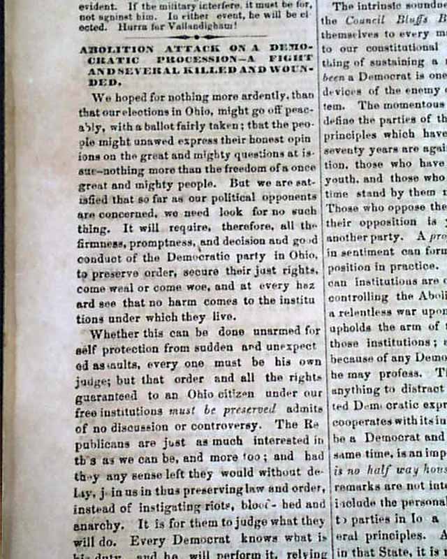 Among the various articles are "The Purpose & Object of Abolition Lies" "General Jackson" "The Campaign In Ohio" "Abolition Attack on a Democratic Procession--A Fight & Several Killed & Wounded" "An Execution In New Orleans" "Arrest on the Charge of Enticing Slaves to Enlist" "Sound as a Nut" "The Burning of Lawrence, Kansas" and more.