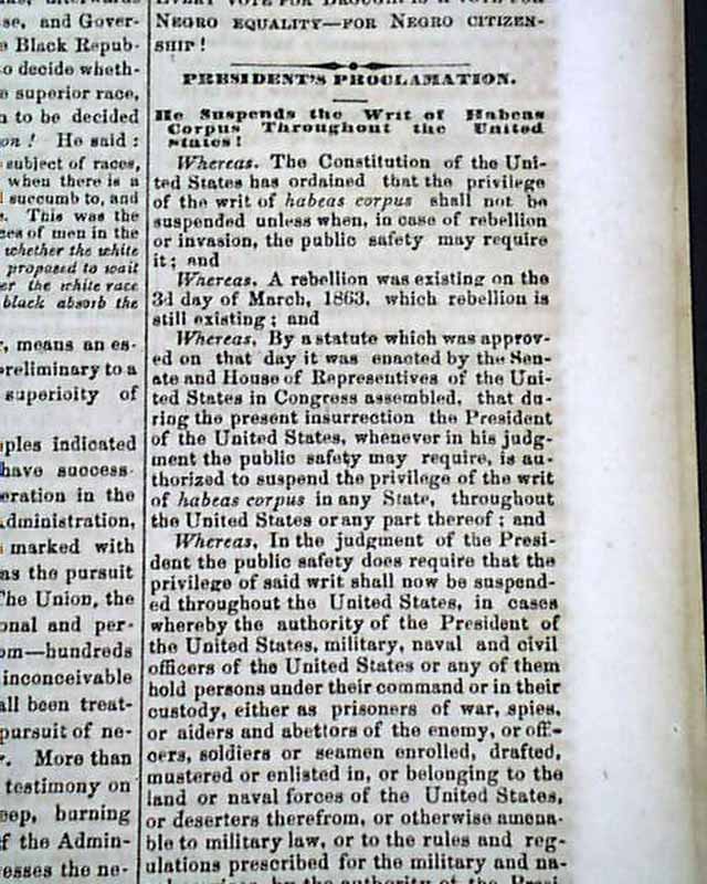 Among the articles is a front page account headed: "President's Proclamation - He Suspends the Writ of Habeas Corpus Throughout the United States" which is signed in type: Abraham Lincoln. Habeas Corpus is a court order demanding that a public official (such as a warden) deliver an imprisoned individual to the court and show a valid reason for that person's detention.