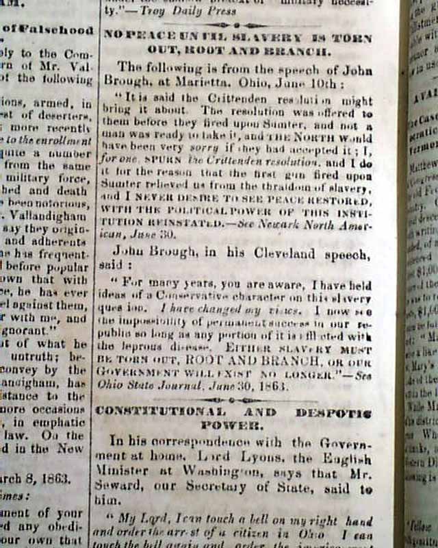 Described as "The Hottest Rebel Sheet to be found in the North or the South", this newspaper opposed the war and attracted the hatred of the Republicans and the Lincoln administration. It insisted that slavery could not be prohibited by law. So obnoxious was this paper to Unionists that it was denied circulation in some cities. In 1863 the press was raided by a hateful mob.