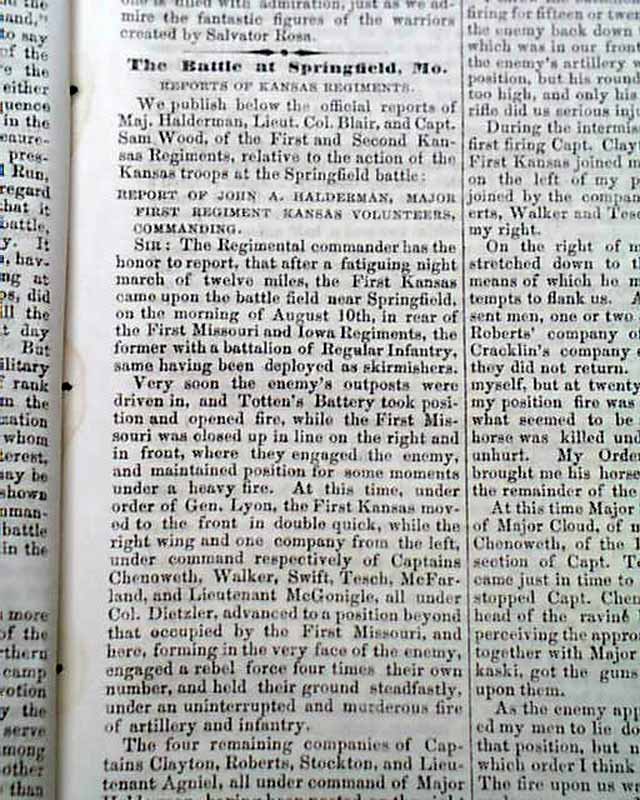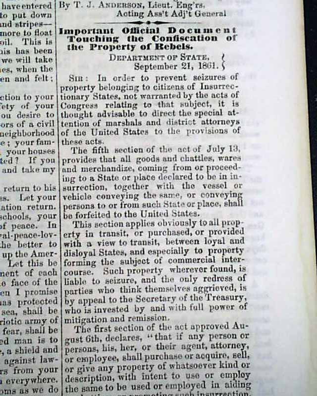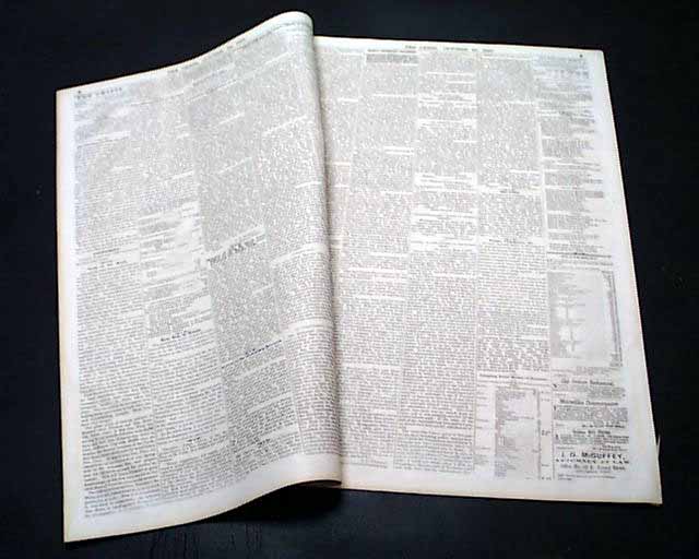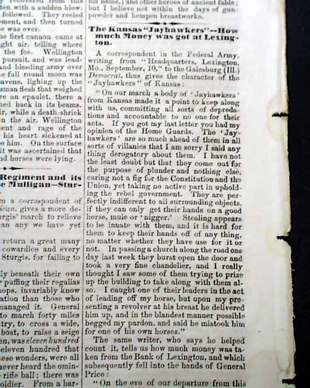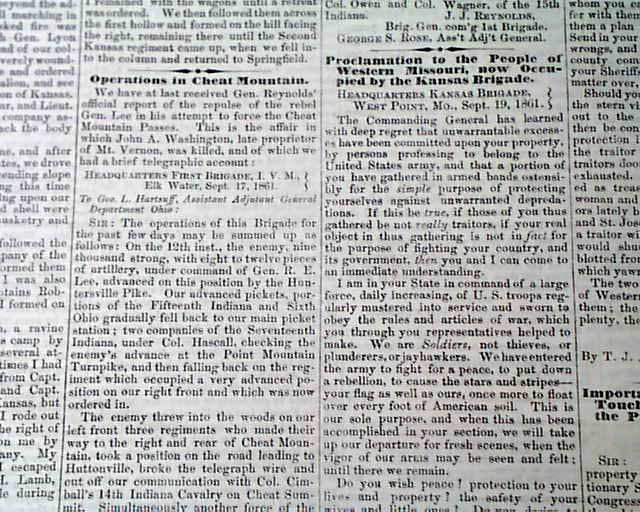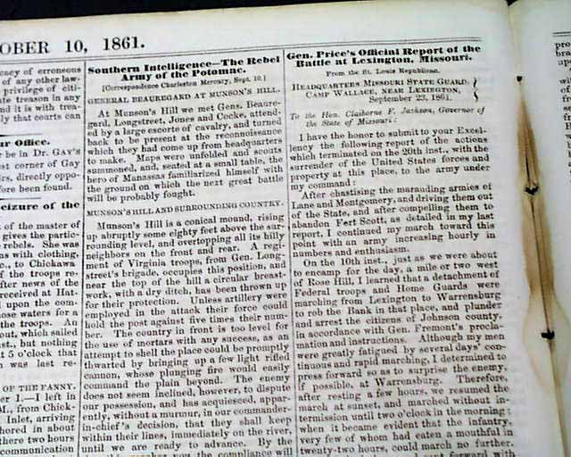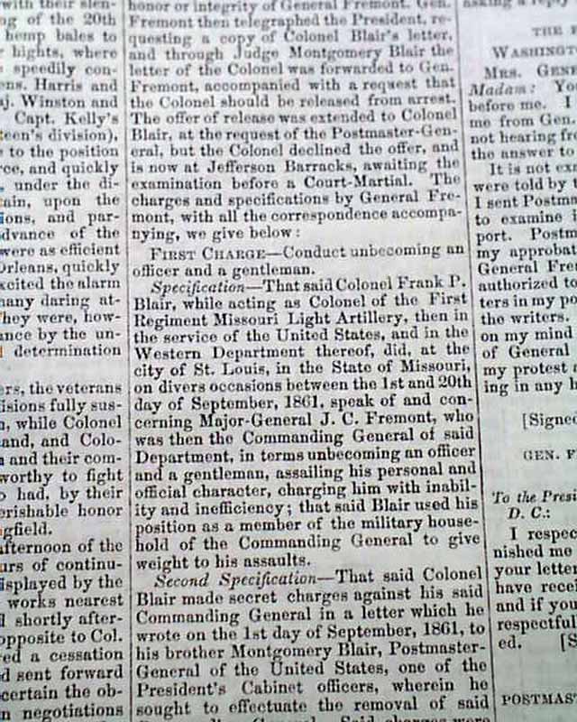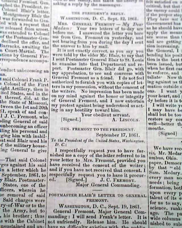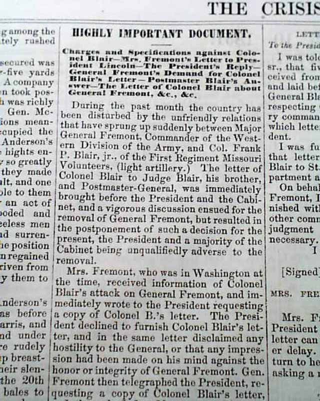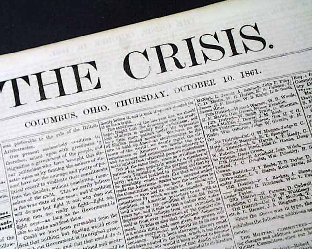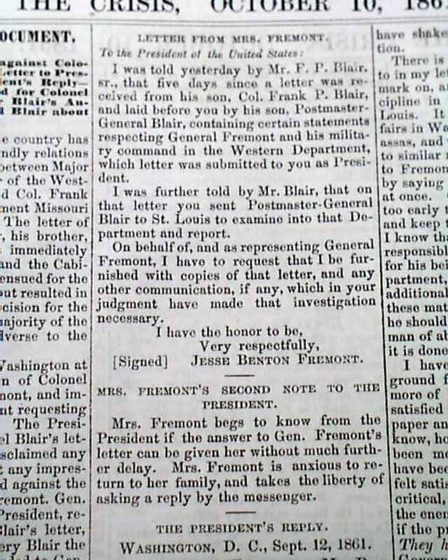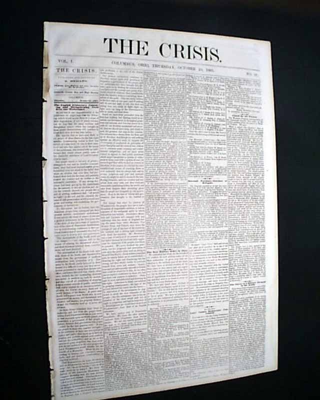THE CRISIS, Columbus, Ohio, Oct. 10, 1861 This was an anti-war newspaper that insisted slavery should not be abolished, so consequently much content has an anti-North bias.Among the articles are: "The Slaves as a Military Element in the South" "The Battle at Springfield, Mo." "Southern Intelligence--The Rebel Army of the Potomac" and much more. Over 2 columns are concerning the controversy between Abraham Lincoln and General Fremont, including a letter from Fremont and his wife and a letter signed: A. Lincoln.Eight pages, very nice condition.