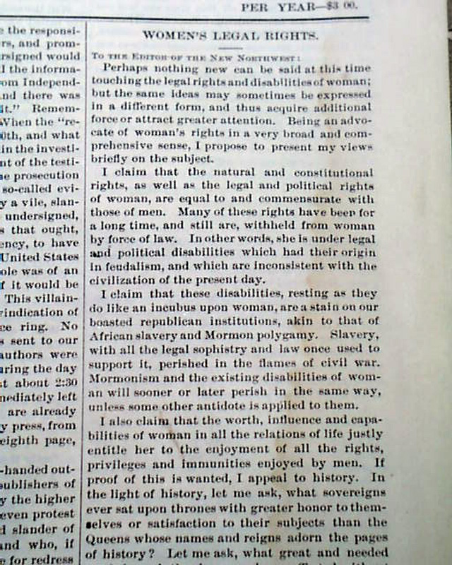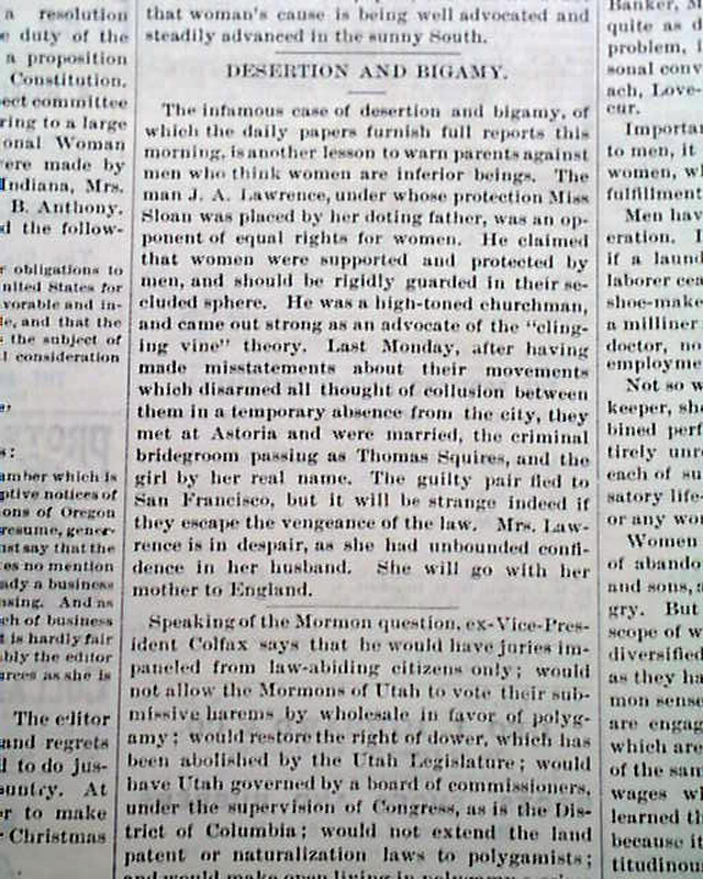 Among the articles: "Women's Legal Rights" "The Woman's College" "John Brown and Fred Douglass" "Desertion & Bigamy" partially concerns the Mormon issue; 'Woman's Cause In The South" and more.