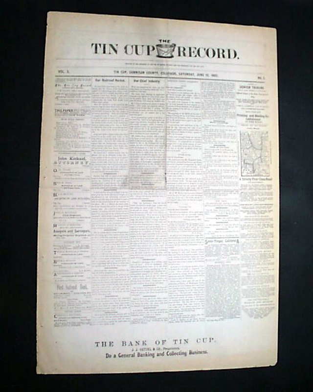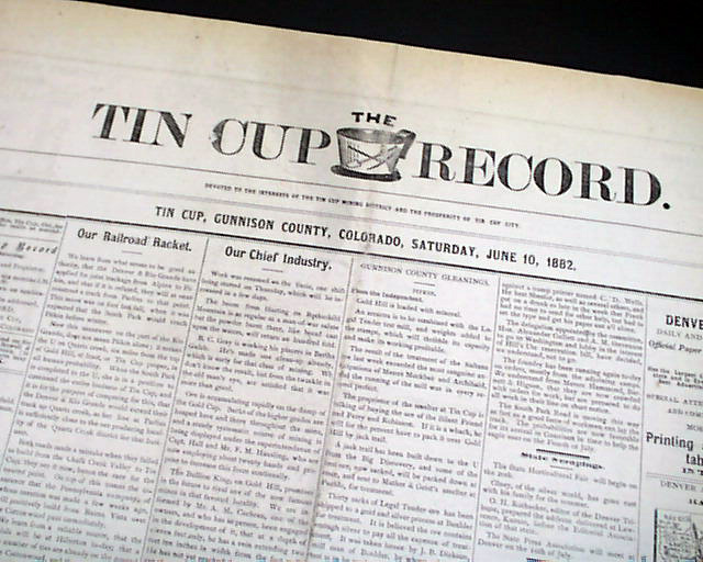 THE TIN CUP RECORD, Virginia City, Gunnison County, Colorado, June 10, 1882 A very rare newspaper as Gregory (Union List of American Newspapers) lists only one institution as having any issues of this title and that holding was recently purchased by us.