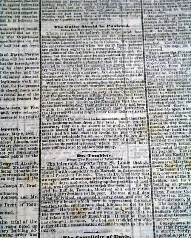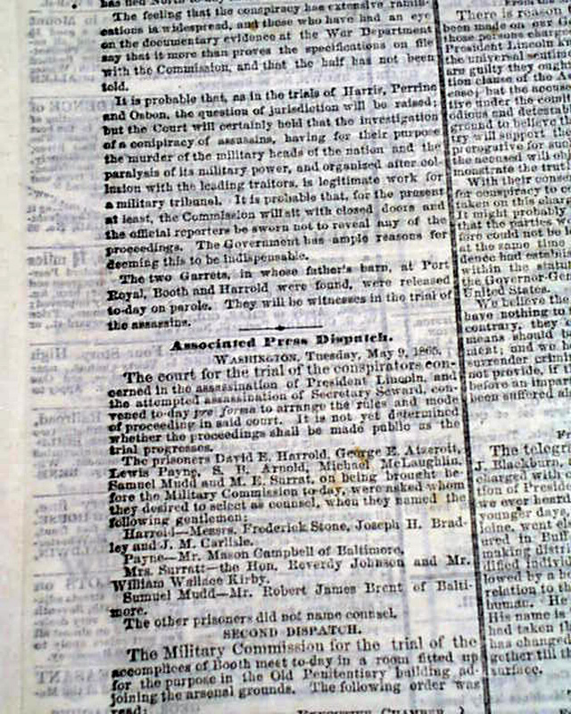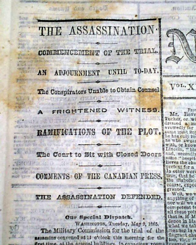 Among the front page one column heads are: "THE ASSASSINATION" "Commencement of The Trial" "The Conspirators Unable to Chain Counsel" "A Frightened Witness" "Ramification of the Plot" "The Assassination Defended" "PROCLAMATIONS BY THE PRESIDENT" "Notice Given to Rebel Pirates" "The State of Virginia" "She is Restored to the Union" and more.
