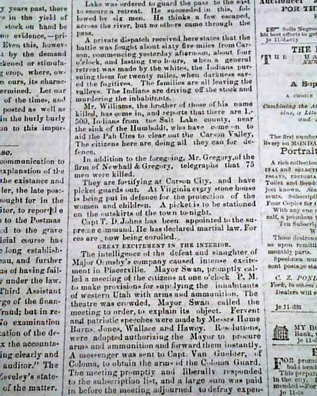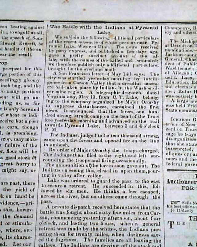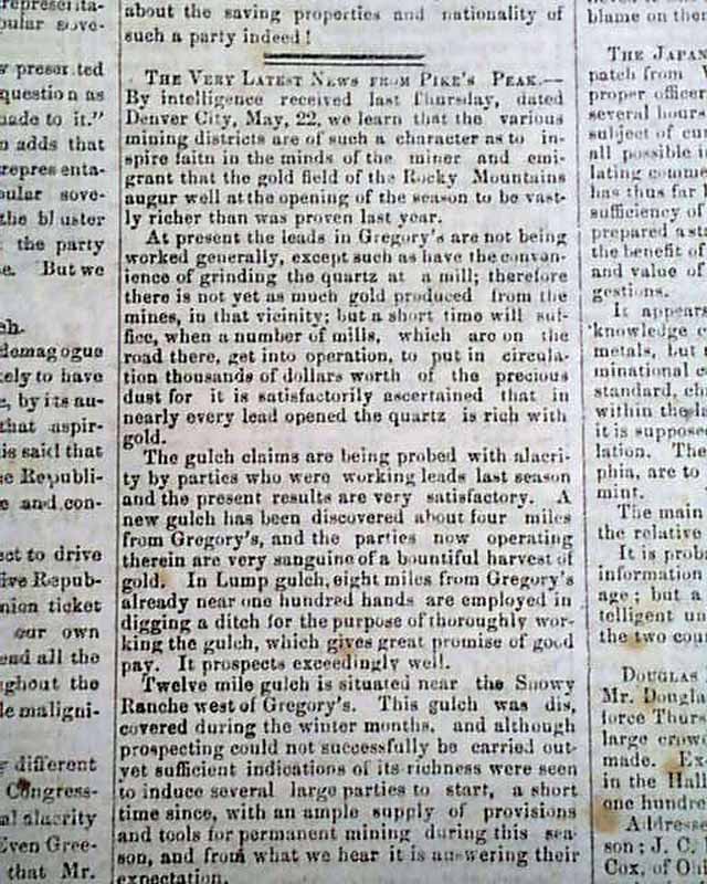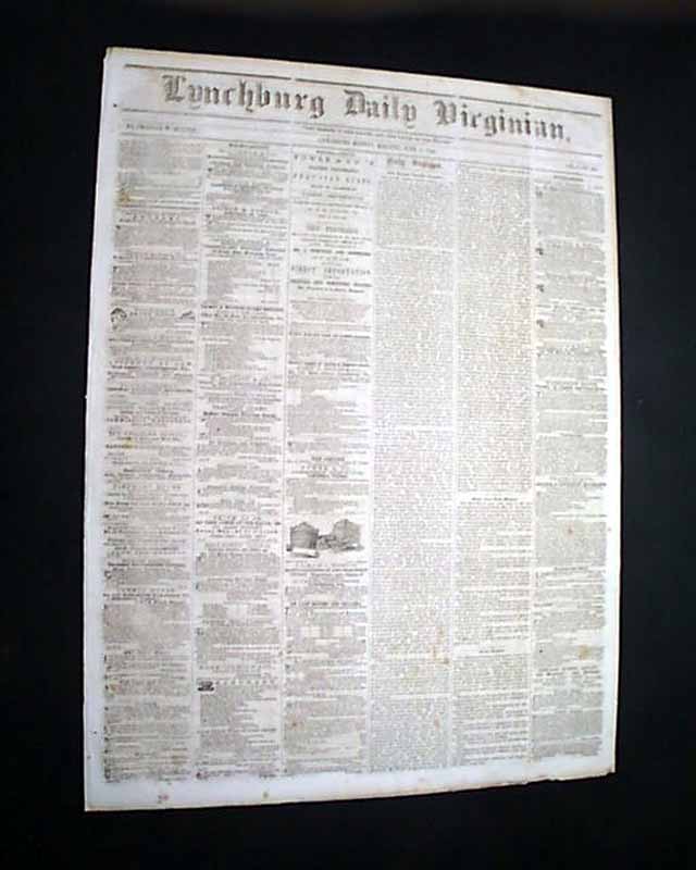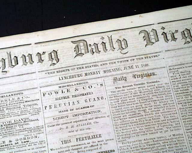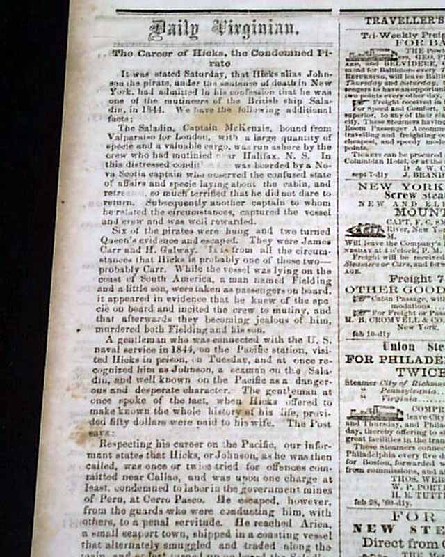 LYNCHBURG DAILY VIRGINIAN, June 11, 1860  Inside includes: "The Very Latest News from Pike's Peak" concerning the gold rush there. Also: "The Battle With the Indians At Pyramid Lake" and: "The Career of Hicks, the Condemned Pirate". This was Albert Hicks, the last person in the U.S. to be hanged for piracy.