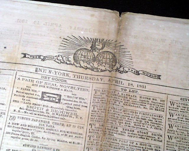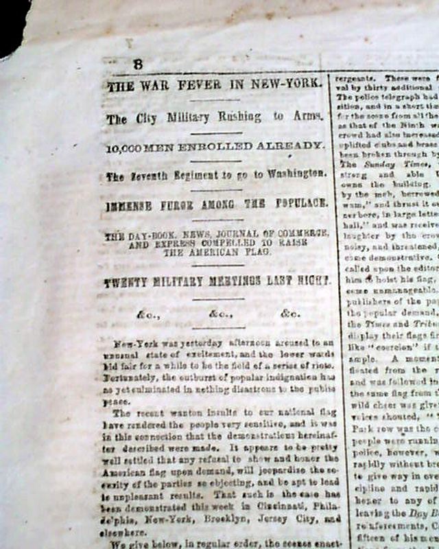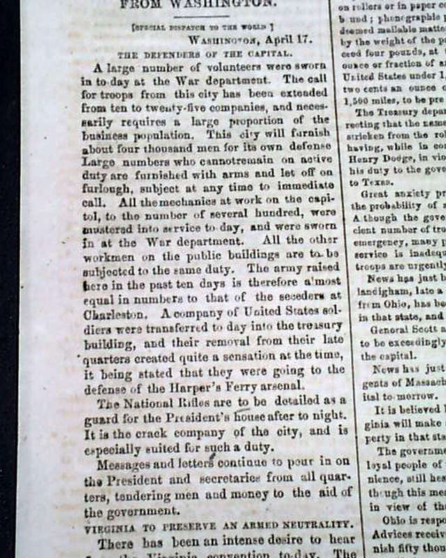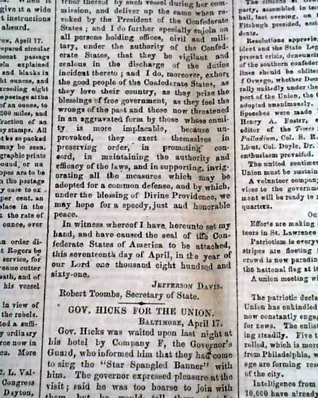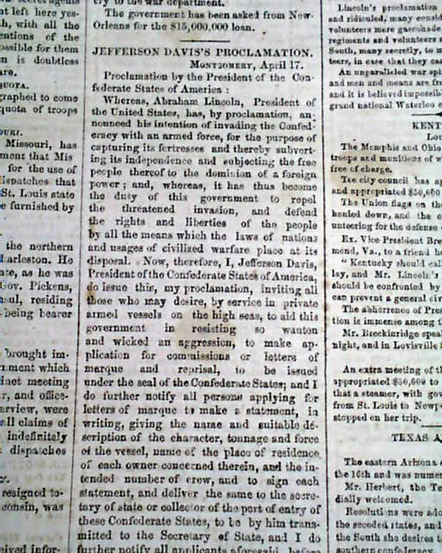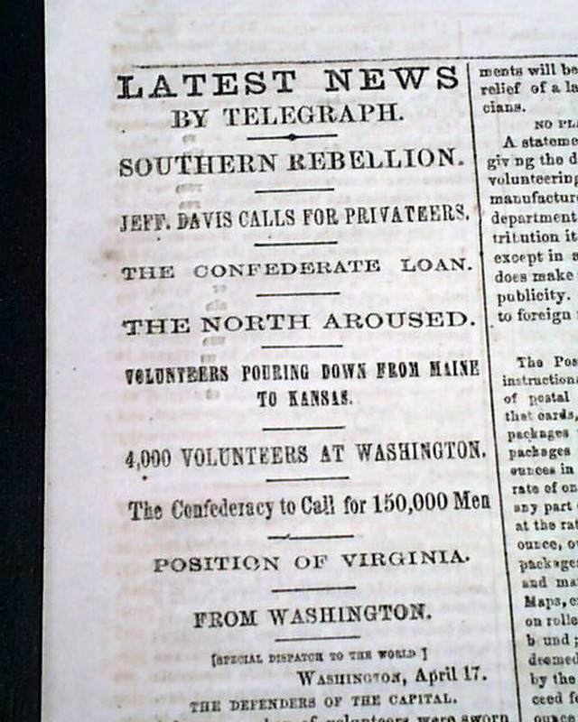 THE WORLD, New York, April 18, 1861  Page 4 has nice column heads on the beginning events of the Civil War: "SOUTHERN REBELLION" "Jeff. Davis Calls For Privateers" "The Confederate Loan" "The North Aroused" "Volunteers Pouring Down From Maine to Kansas" "4,000 Volunteers at Washington" "The Confederacy to Call for 150,000 Men" with the full text of the Proclamation signed in type: Jefferson Davis.