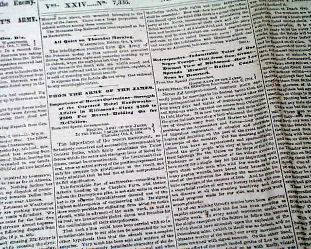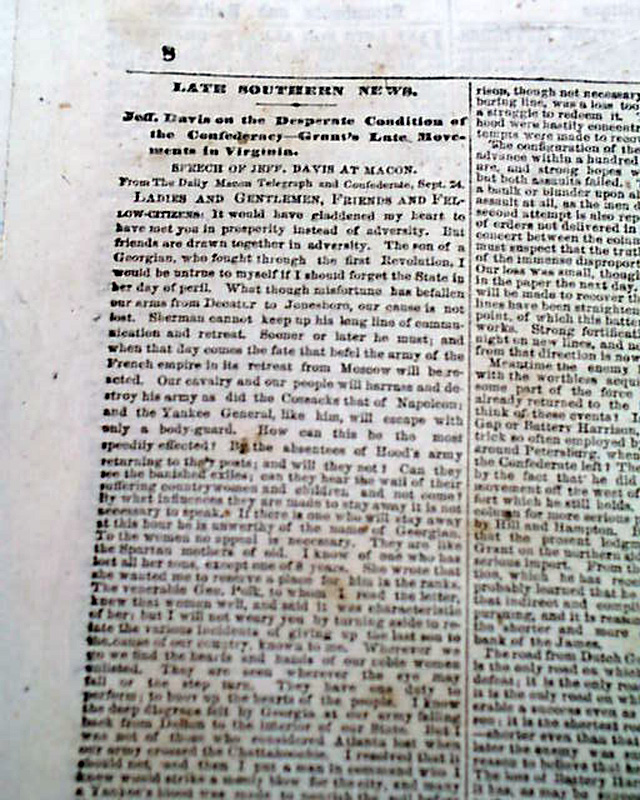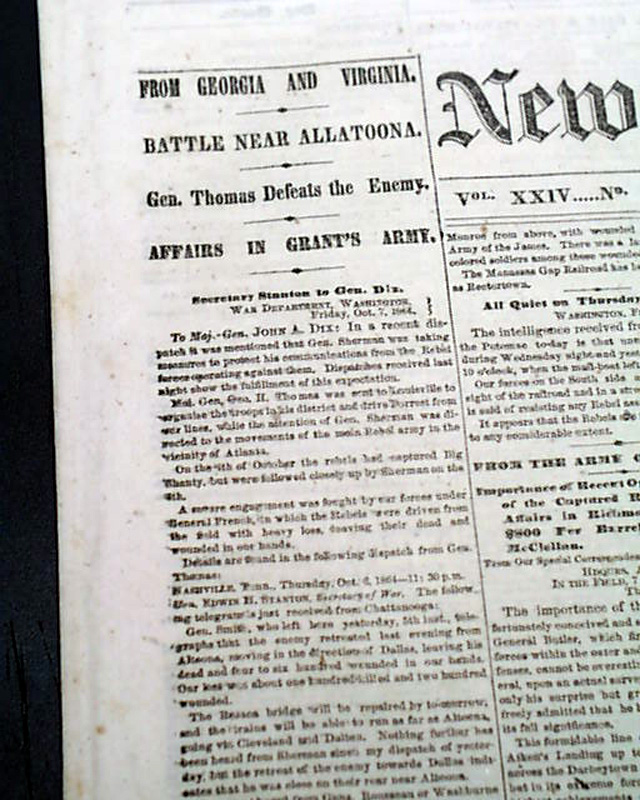 NEW YORK TRIBUNE, Oct. 8, 1864 Front page column heads on the Civil War: "From Georgia & Virginia" "Battle Near Altoona" "Gen. Thomas Defeat the Enemy" "Affairs In Grant Army" "From the Army of the James" "From Port Royal" and more.