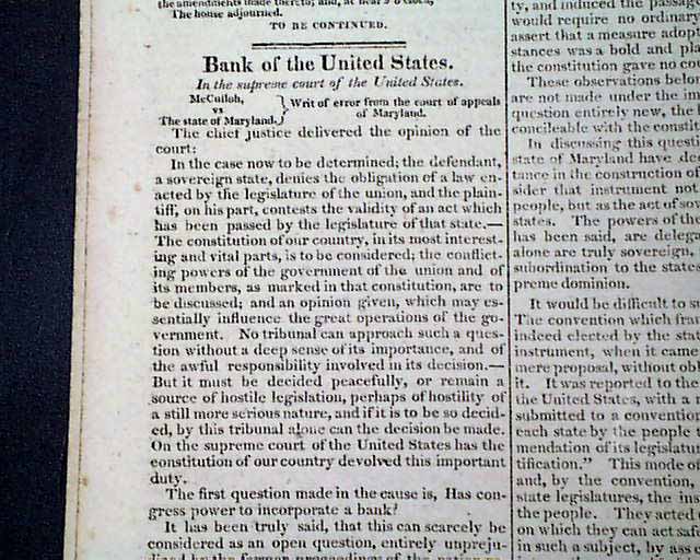 This is the case of McCulloch vs. the state Maryland, the text headed: "Bank of the United States - In the Supreme Court of the United States", with the lengthy text containing the Chief Justice's opinion, he being John Marshall. This landmark decision concerns the right of Maryland to tax a branch of the federal bank operating within its borders.