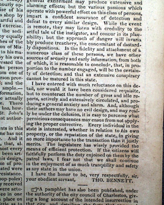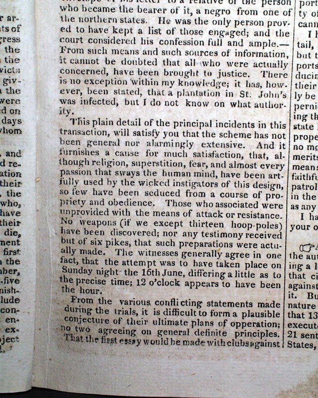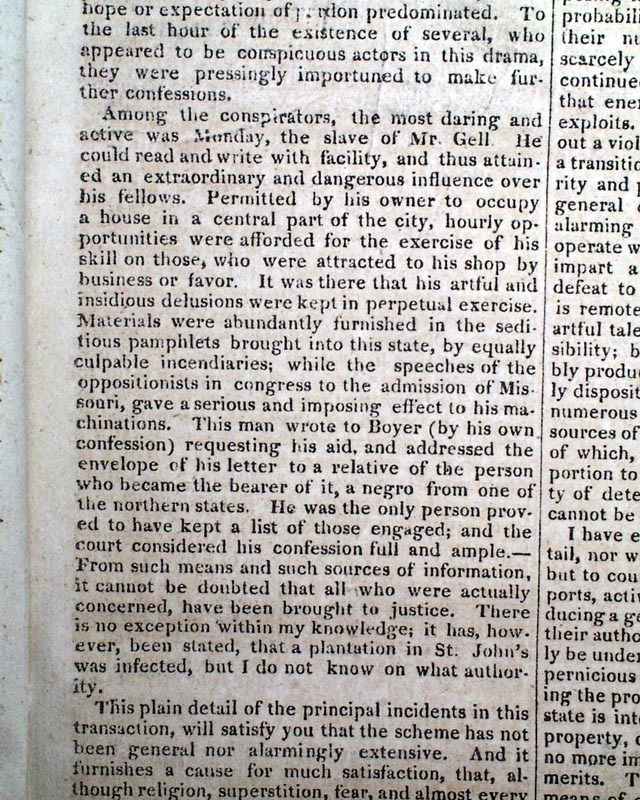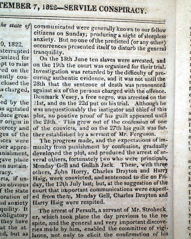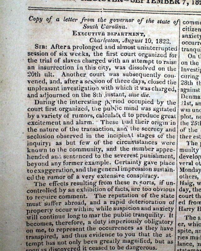 NILES' WEEKLY REGISTER, Baltimore, Sept. 7, 1822 Pages 9-11 have much regarding Denmark Vesey and the "Servile Conspiracy in South Carolina," which has a report of the Denmark Vesey slave revolt.