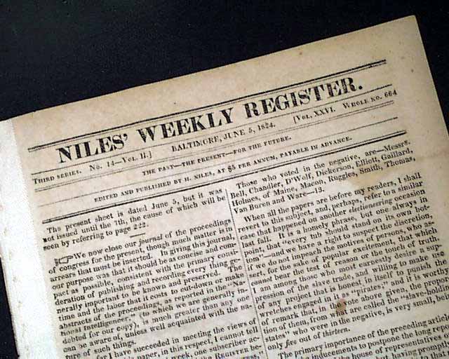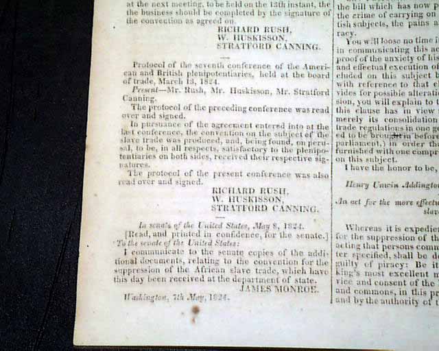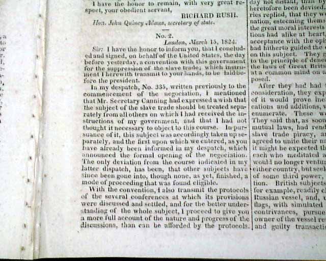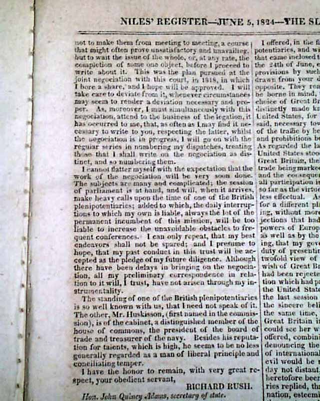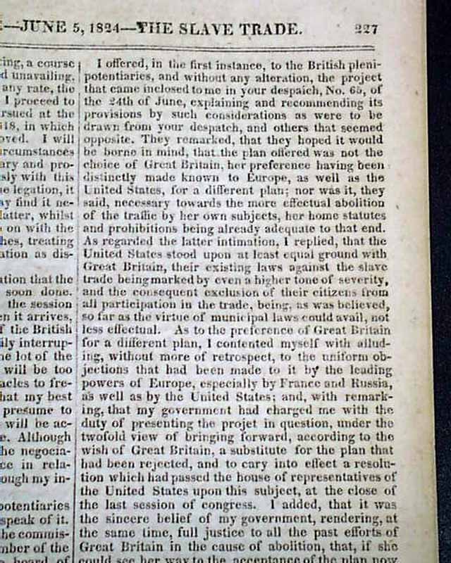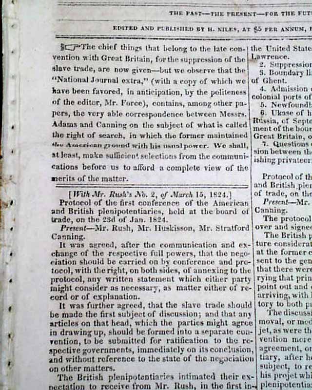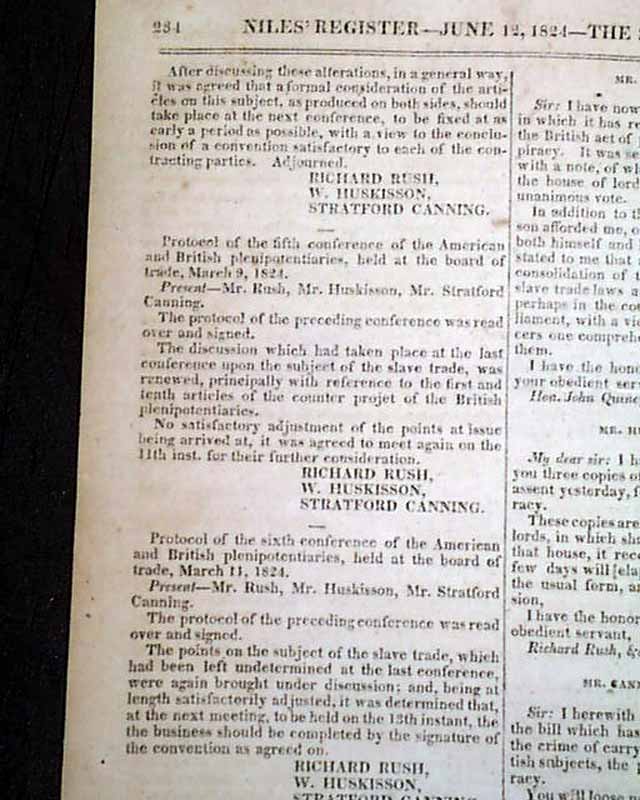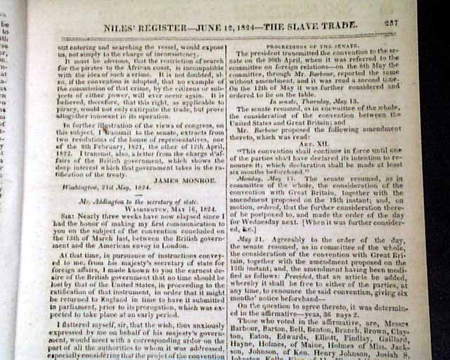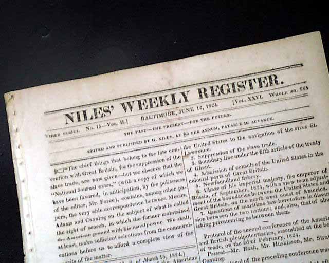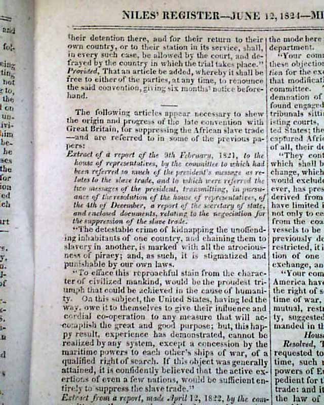 NILES' WEEKLY REGISTER, Baltimore, June 5 and 12, 1824 This is a pair of consecutive issues covering the agreements with England and the various documents and discussions relating to the: "Suppression of the Slave Trade" which was enacted in 1824.