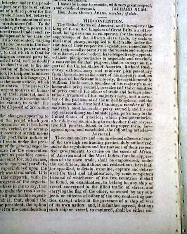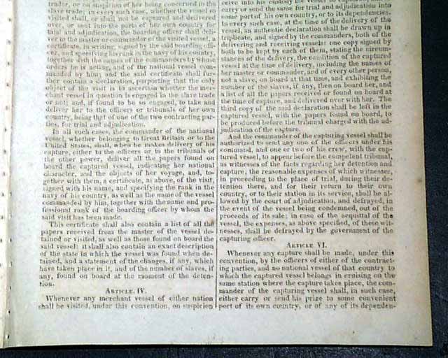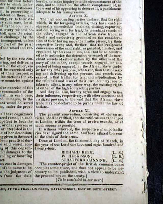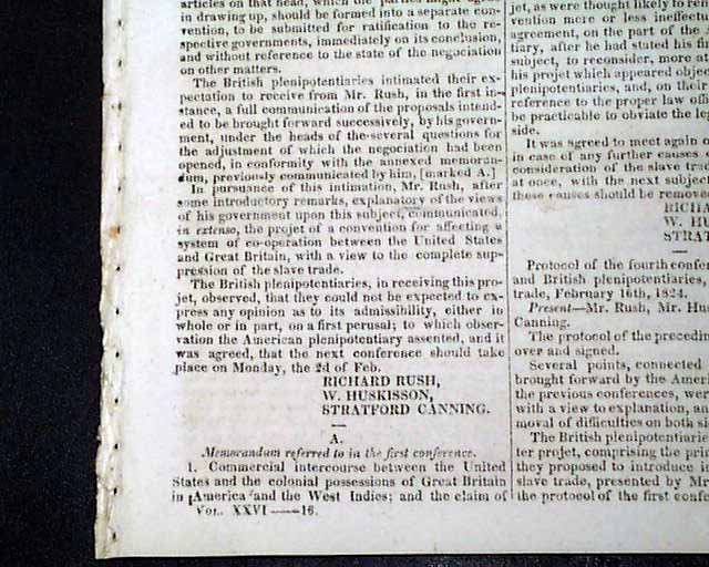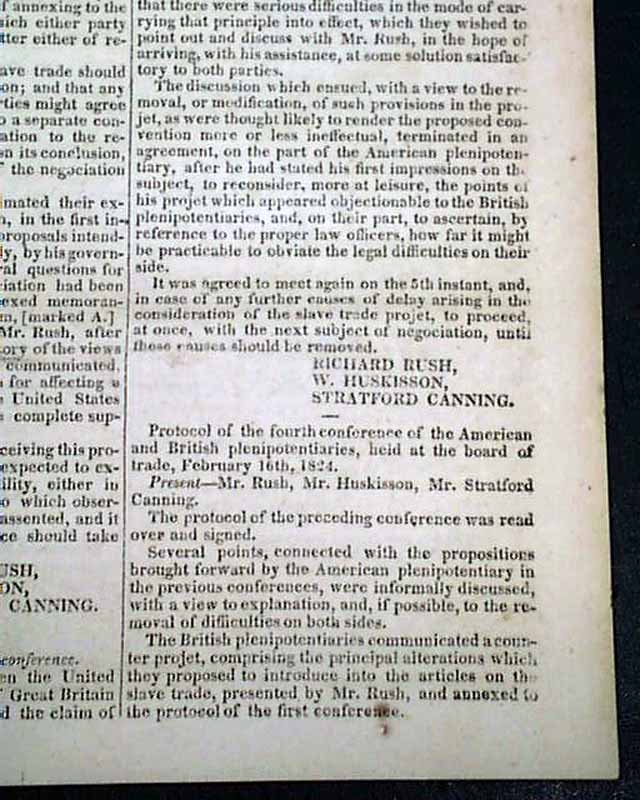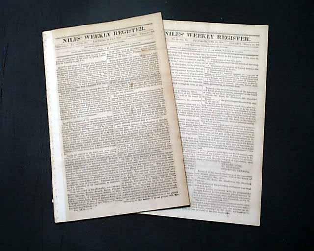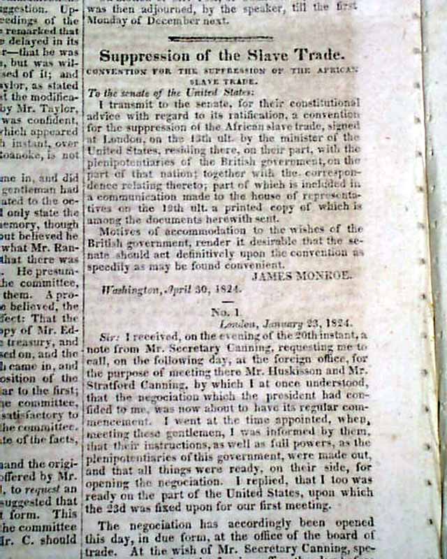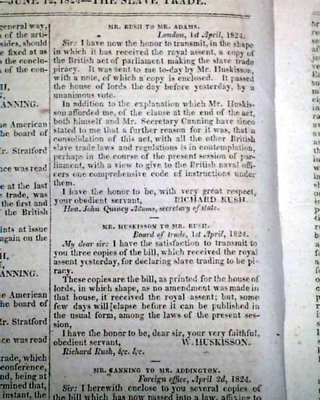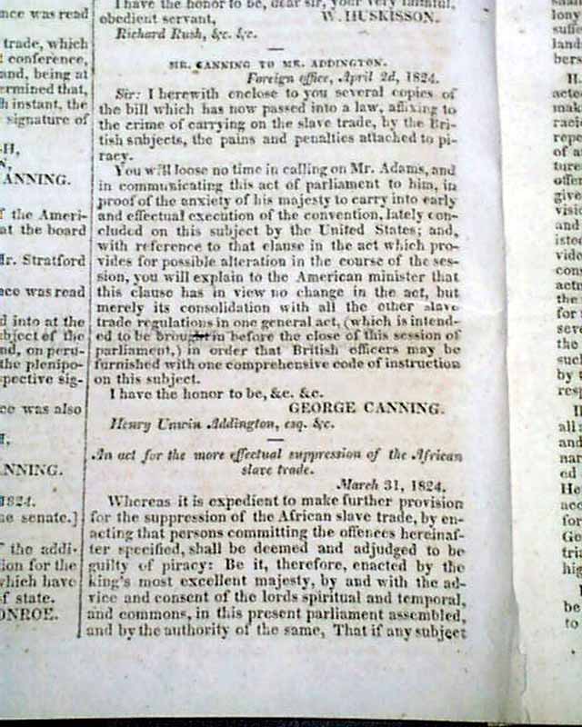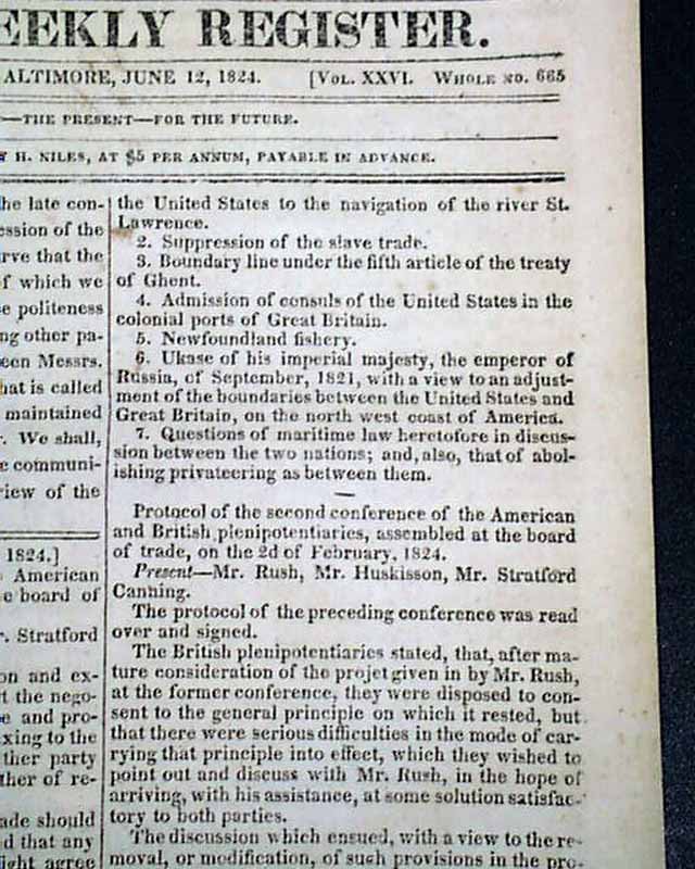 NILES' WEEKLY REGISTER, Baltimore, June 5 and 12, 1824 This is a pair of consecutive issues covering the agreements with England and the various documents and discussions relating to the: "Suppression of the Slave Trade" which was enacted in 1824.