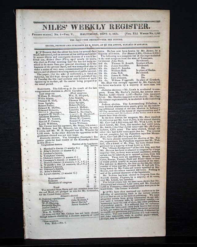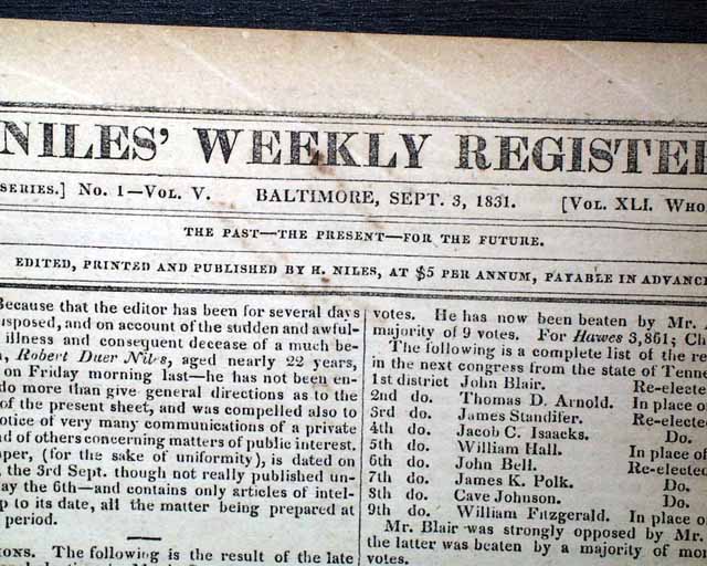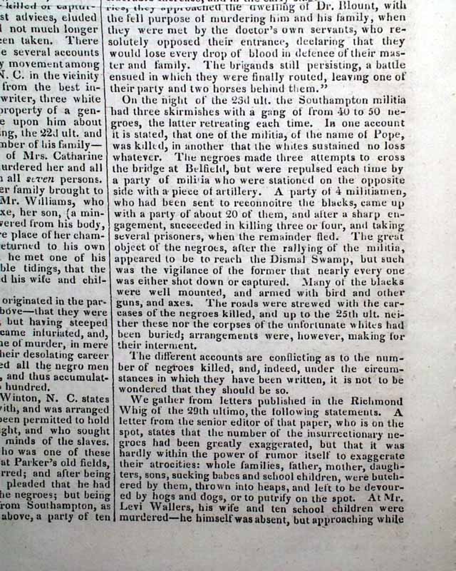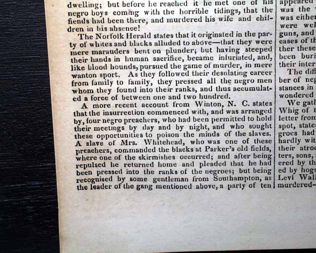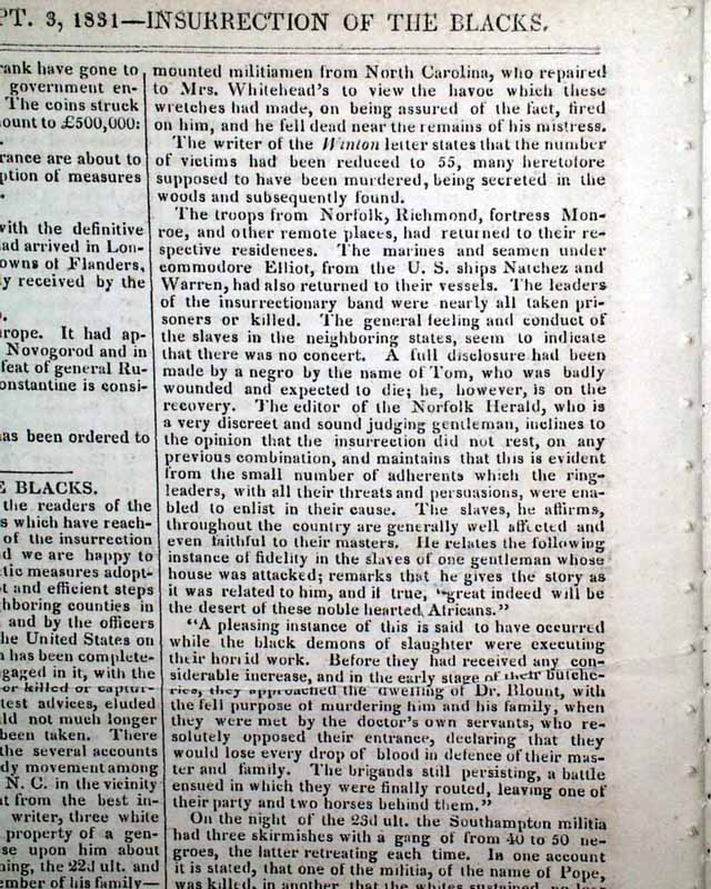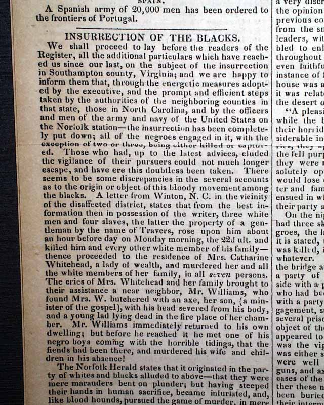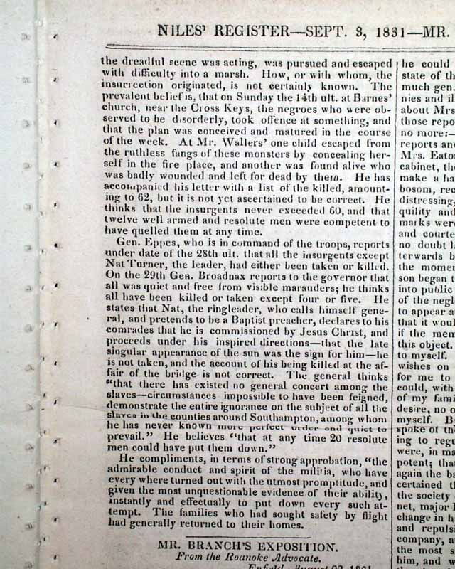NILES' WEEKLY REGISTER, Baltimore, Sept. 3, 1831 Certainly the most significant report in this issue is an excellent and detailed account of the slave insurrection in Virginia, let by Nat Turner.