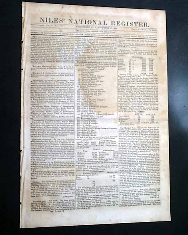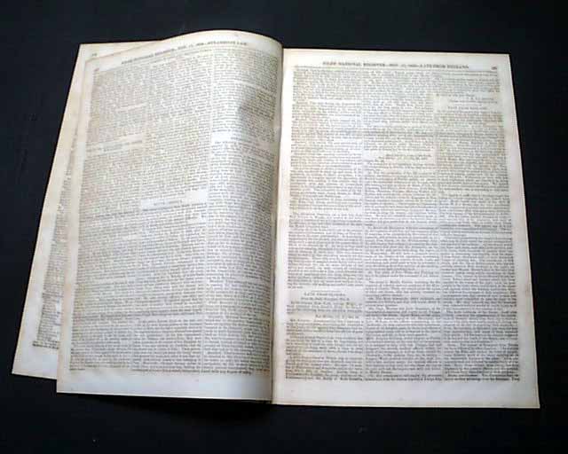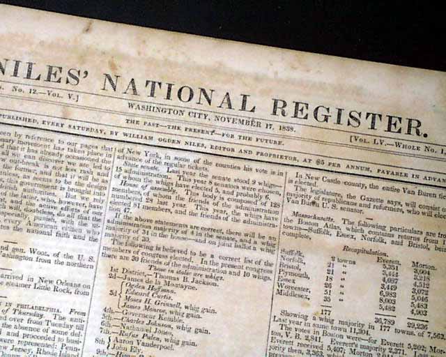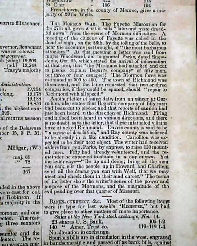 NILES' NATIONAL REGISTER, Washington City, Nov. 17, 1838 The front page has a very nice item headed: "The Mormon War" portions of which include: "...from the scene of the Mormon difficulties. A meeting of the citizens of Fayette was called...to hear the accounts just brought of 'the most barbarous atrocities'. ..a letter was read from Major Woodward...Oct.25 which stated the arrival of information at the post that the Mormons had attacked and cut to pieces captain Bogart's company of 50 men but three or four escaped! The Mormon force was estimated at 300 to 400. The town of Richmond was threatened...reports of cannon had just been heard in the direction of Richmond. Firing had indeed been heard in various directions....Davis county is said to be a scene of desolation & Ray county we believe to be already in a like condition. Carrollton was expected to be their next object...terms of the letter show the writer's sense of the power & purpose of the Mormons and the magnitude of the evil pending over that quarter of Missouri." and much more.