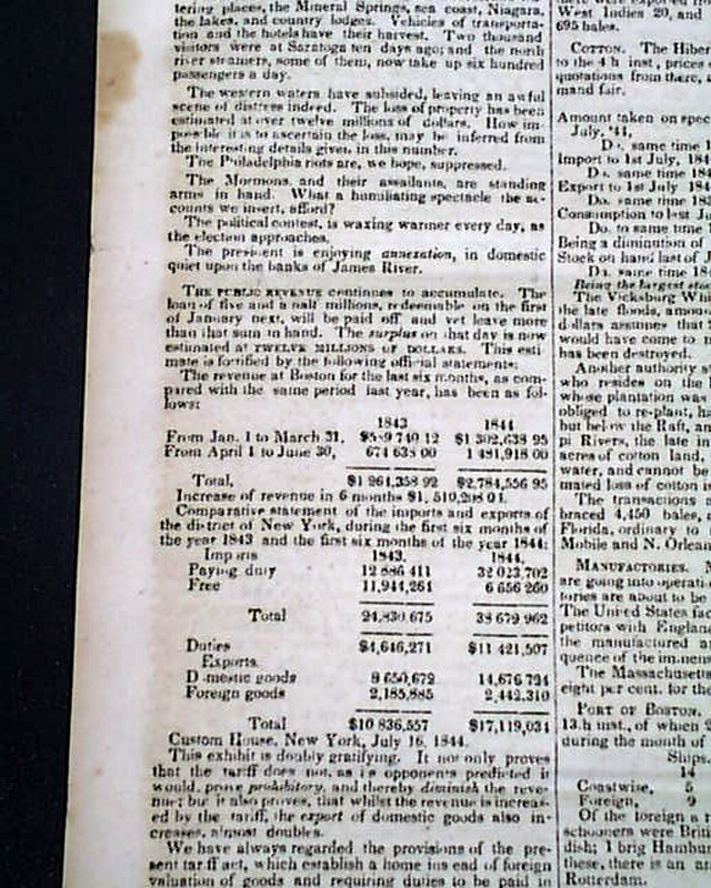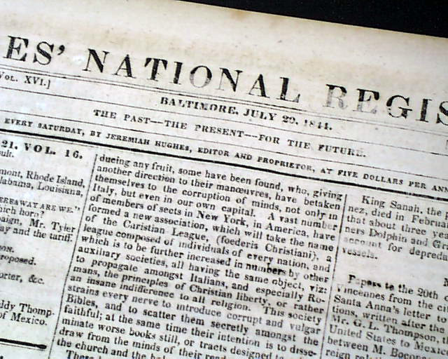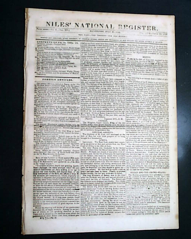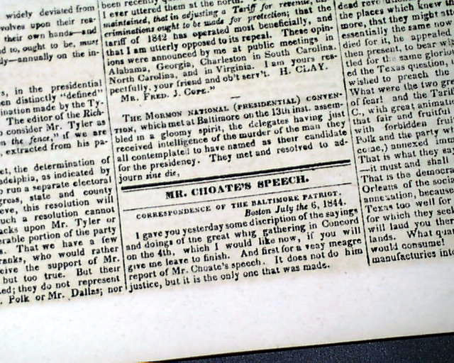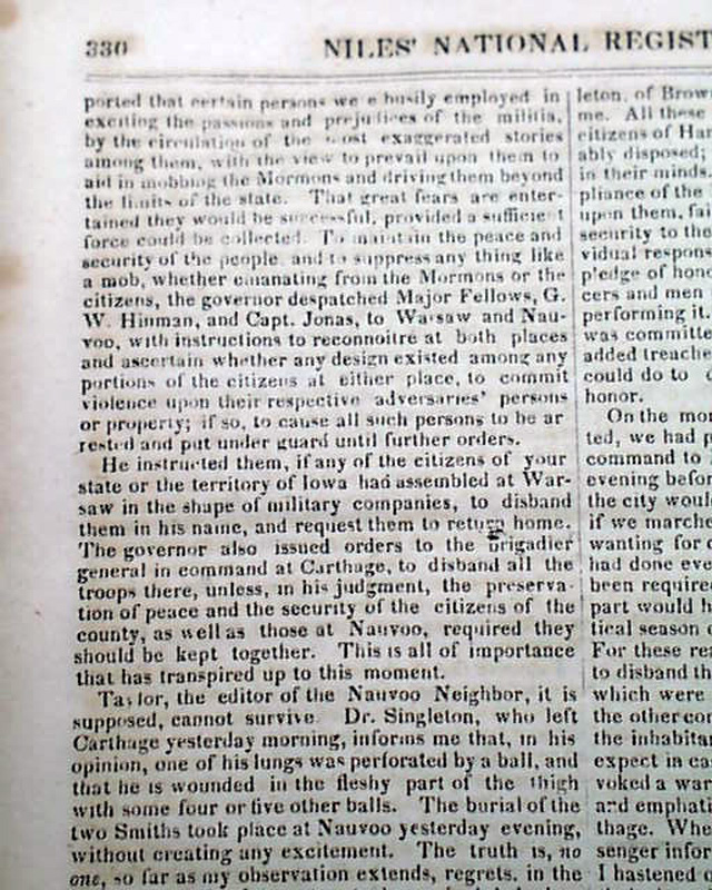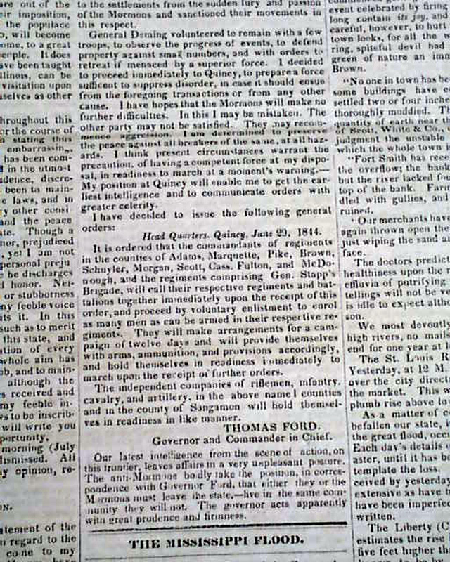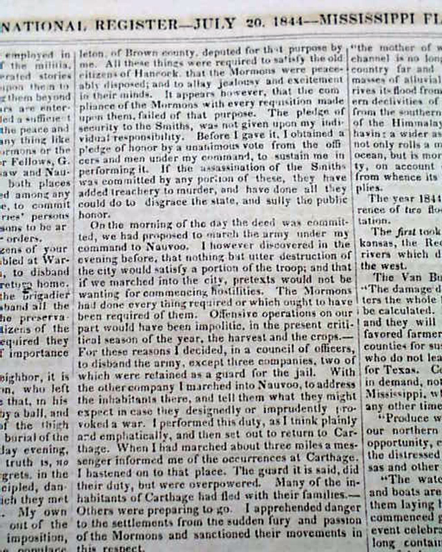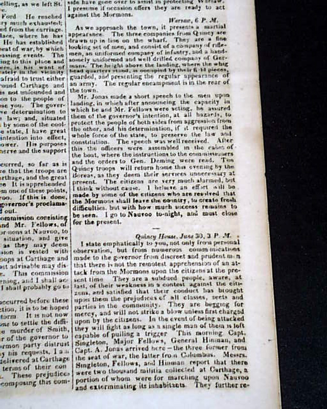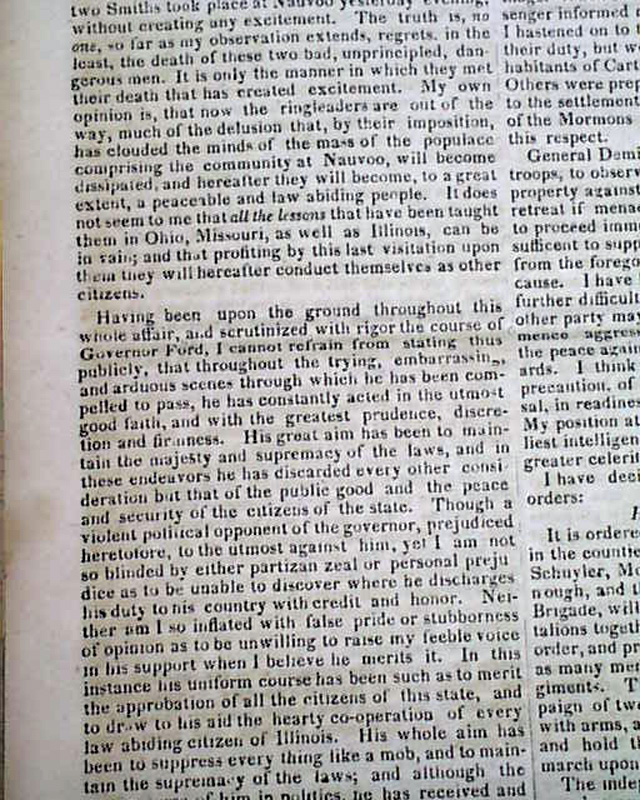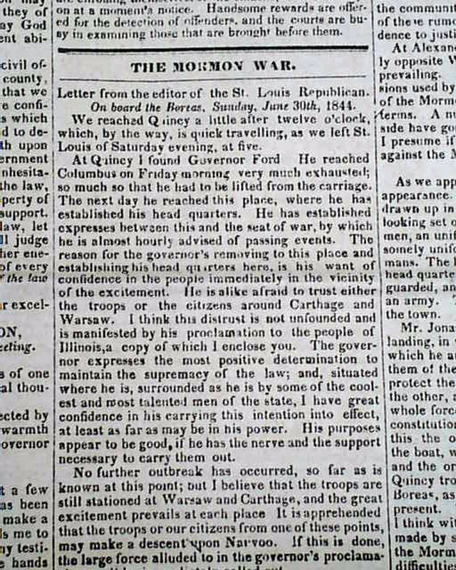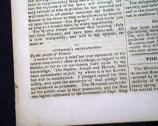 Also within is an article headed: "The Mormon War" which takes over half of one page and two-thirds of the following page, and includes the "Governor's Proclamation" which notes: "...the Smiths, Joseph and Hyram, have been assassinated in jail; by whom it is not known..." with much more. And the back page has a brief item: "The Mormons & their assailants are standing arms in hand. What a humiliating spectacle the accounts we insert afford?"