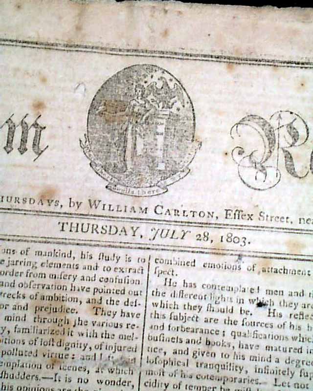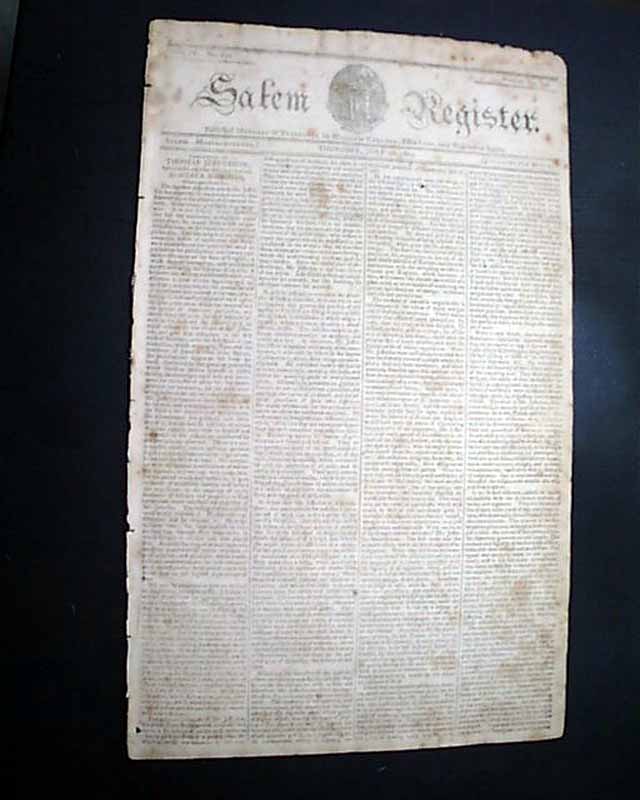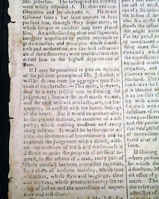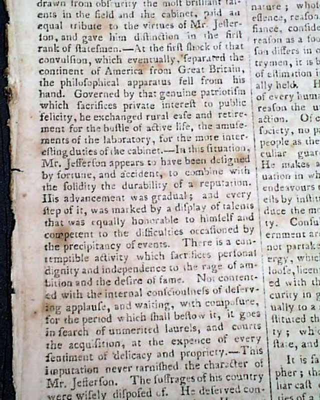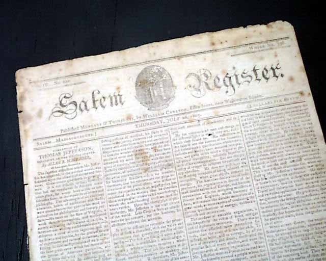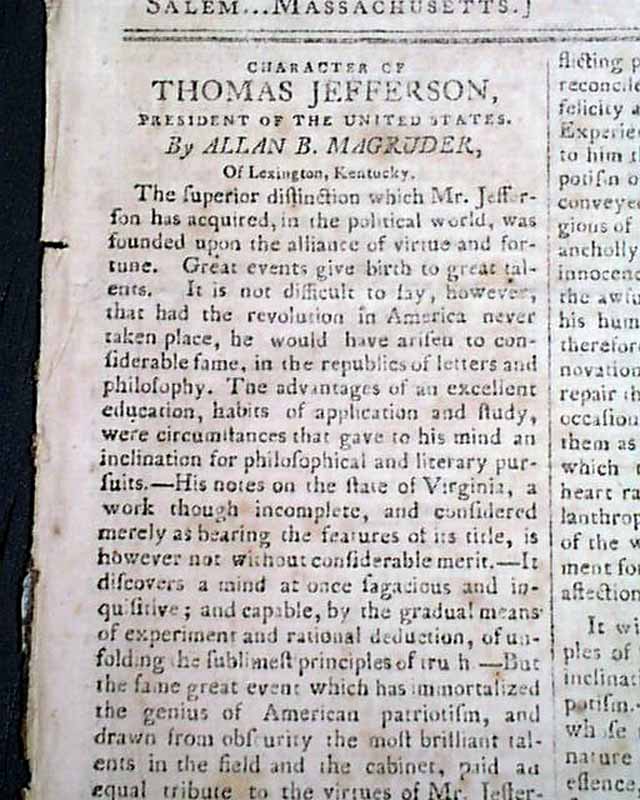 SALEM REGISTER, Massachusetts, July 28, 1803 The entire front page ks taken up with a very lengthy & detailed article headed: "Character Of THOMAS JEFFERSON, President of the United States. by Allan B. Magruder".