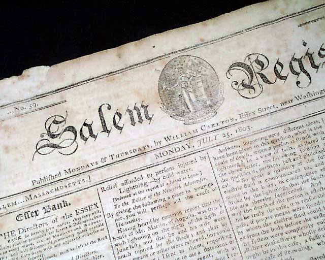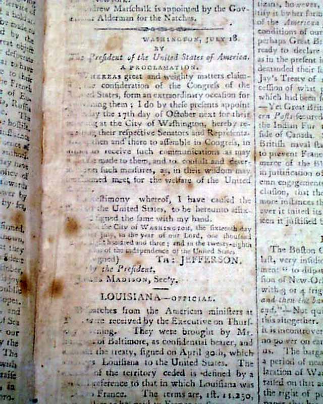 SALEM REGISTER, Massachusetts, July 25, 1803  Page 3 has: "A Proclamation" signed by the President; Th. Jefferson, calling for a special session of Congress.