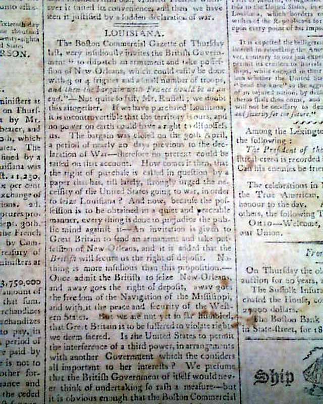This is followed by a very historic report: "Louisiana--Official" which reports the news that the French have signed the Puchase treaty on April 30, conveying Louisiana to the United States. Further details as seen in the photos.
