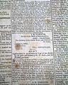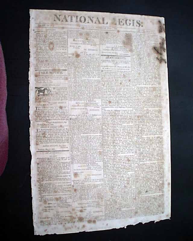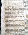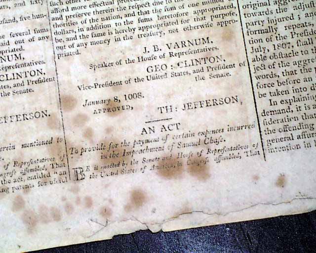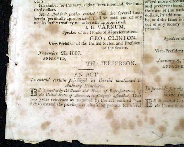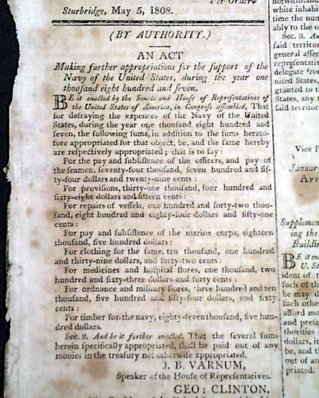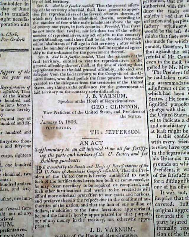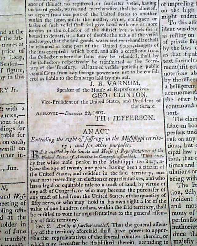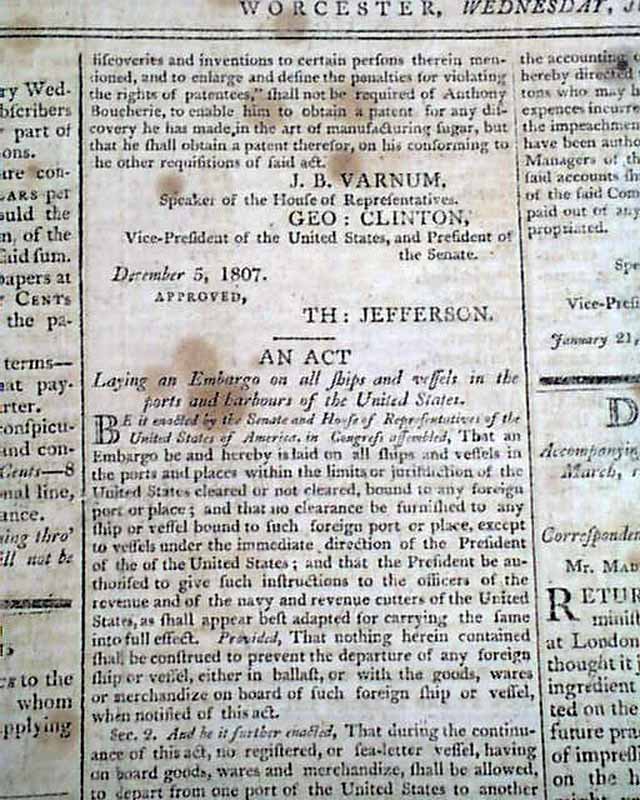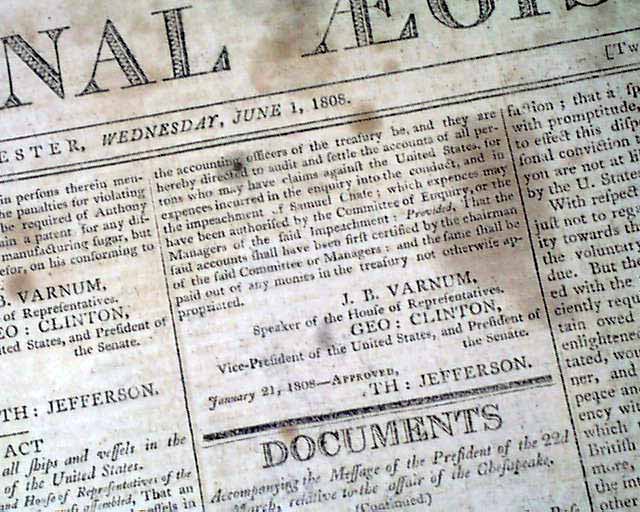 NATIONAL AEGIS, Worcester, Massachusetts, June 1, 1808 The front page contains six Acts of Congress, one for providing money for the support of the Navy of the United States, another for laying an Embargo on all ship & vessels, another for providing voting rights to those in the Mississippi Territory, and another concerning an act for fortifying the ports & harbors of the U.S., and for building gun-boats. Each is signed in type by the President: Th. Jefferson.