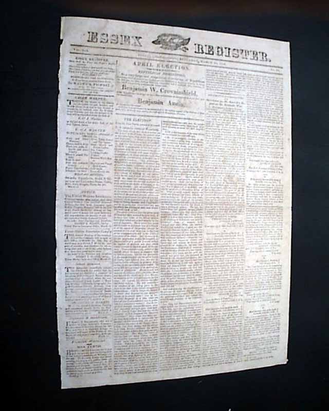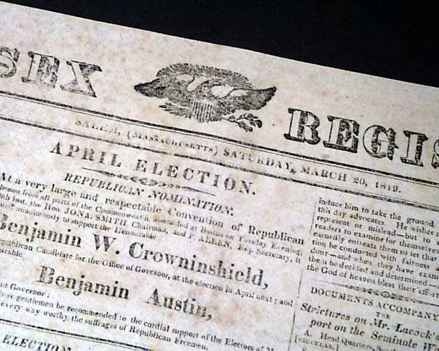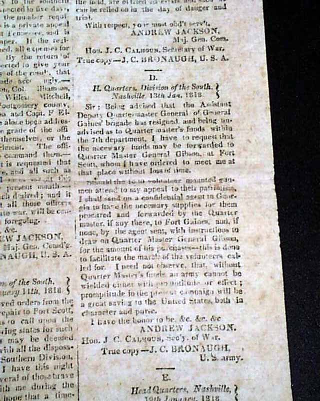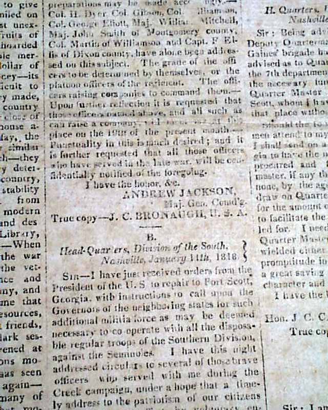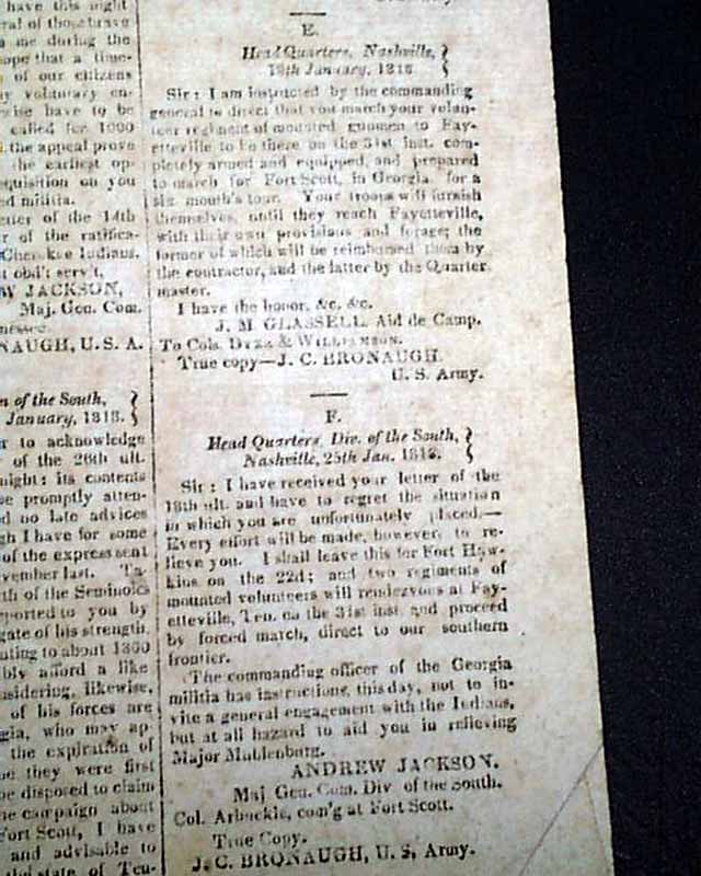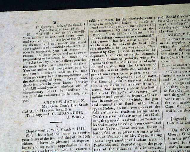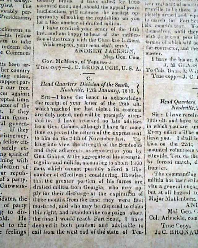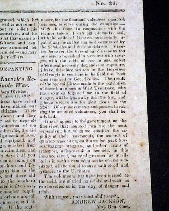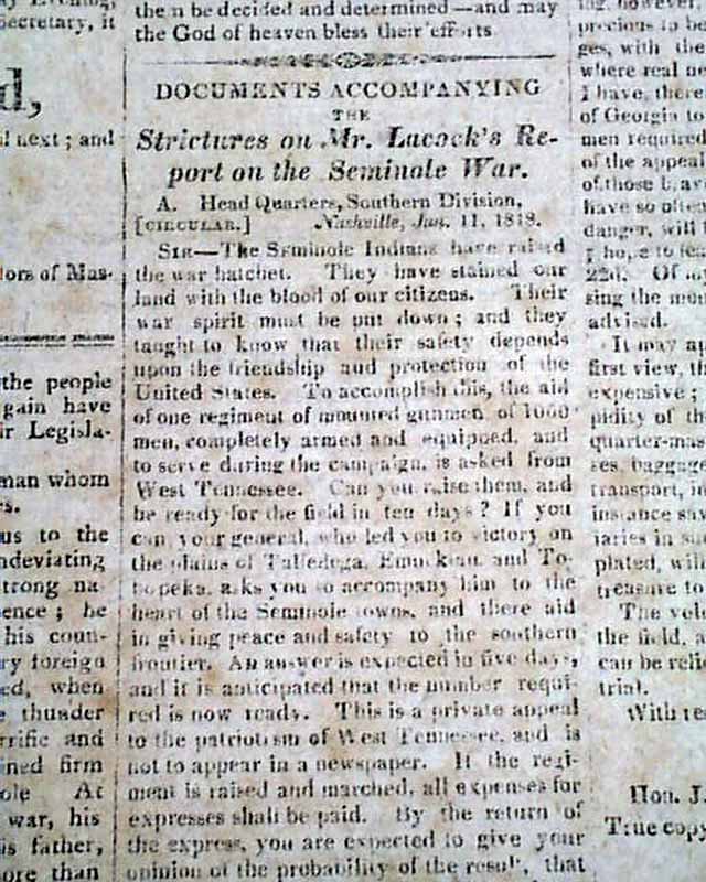 ESSEX REGISTER, Salem, Massachusetts, March 20, 1819 Over a full page of reports--half on the front page and half on page 2--is taken up with: "Documents Accompanying the Strictures on Mr. Lacock's Report on the Seminole War", this being the first of 3 Seminole Wars. Included are 6 letters signed by: Andrew Jackson.