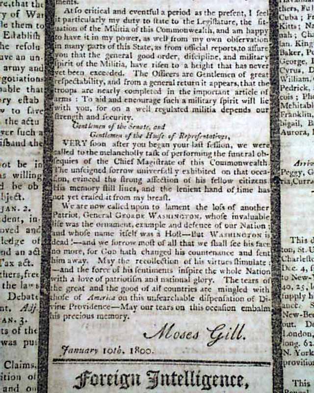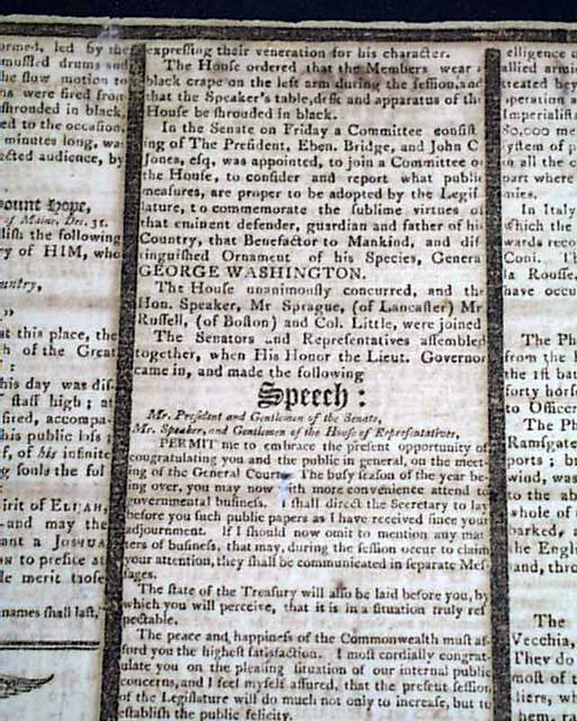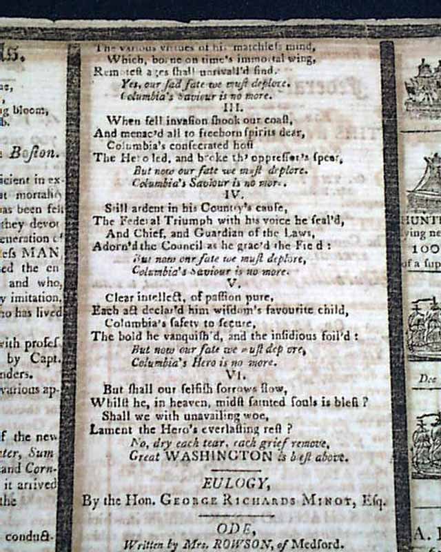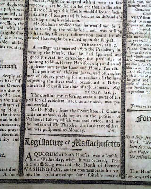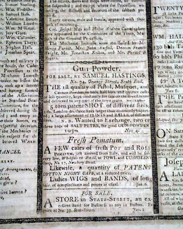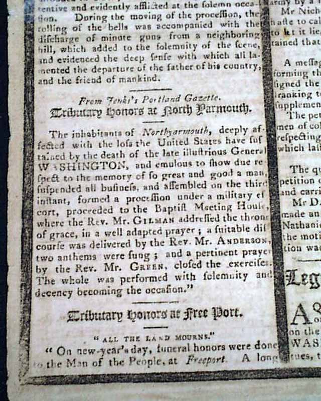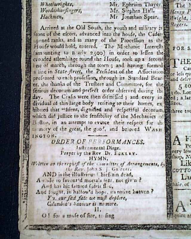 J. RUSSELL'S GAZETTE, COMMERCIAL & POLITICAL, Boston, Jan. 13, 1800 The front page has wide, black mourning rules, and the borders and all columns on pages 2, 3 & 4 also have wide, black mourning rules for the death of George Washington.