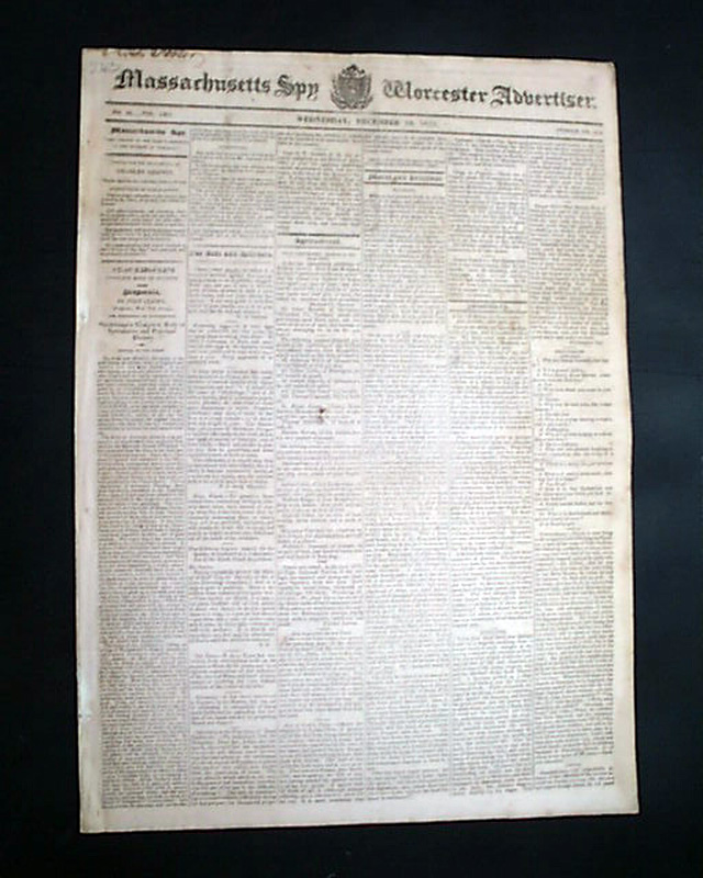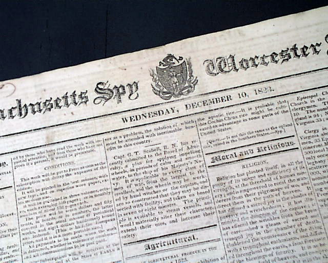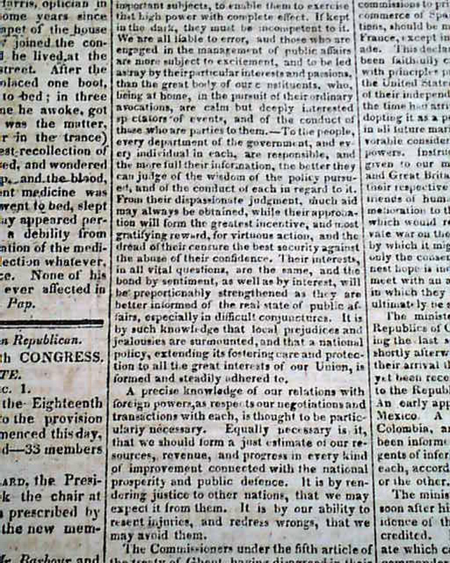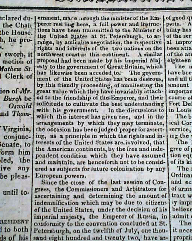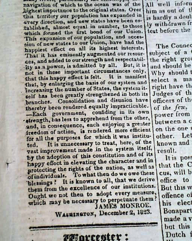MASSACHUSETTS SPY & WORCESTER ADVERTISER, Dec.  10, 1823  Pages 2 and 3 contain the "MESSAGE" being James Monroe's annual address to Congress.