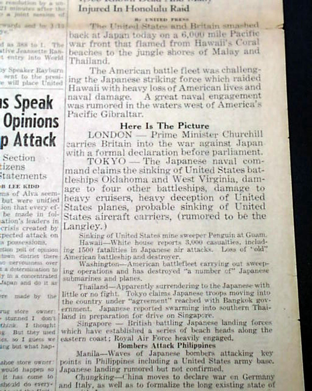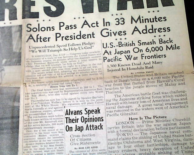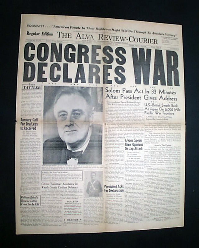 THE ALVA REVIEW-COURIER, Oklahoma, Dec. 8, 1941 the bold, large, banner headline announces America's entry into World War II: "CONGRESS DECLARES WAR" with related subheads and a photo of President Franklin D. Roosevelt.