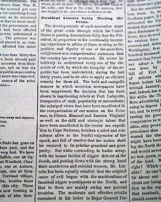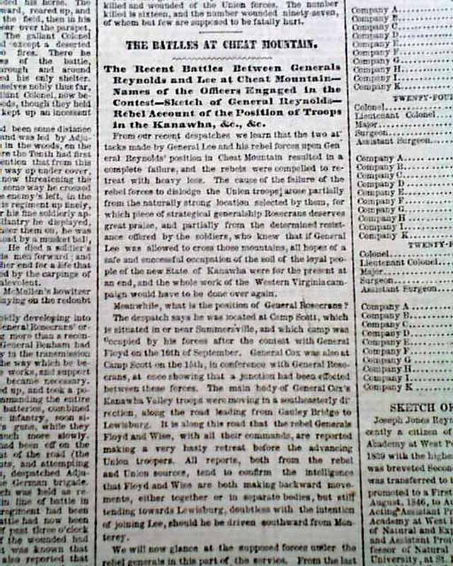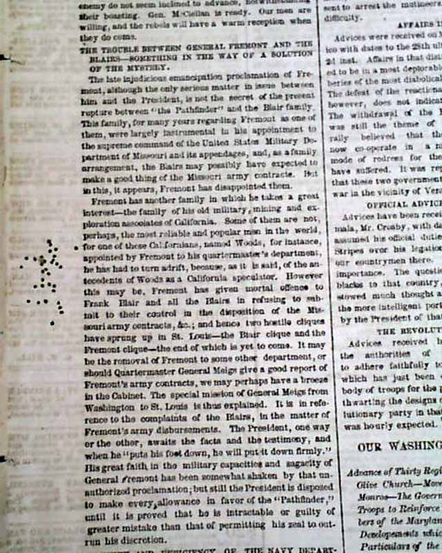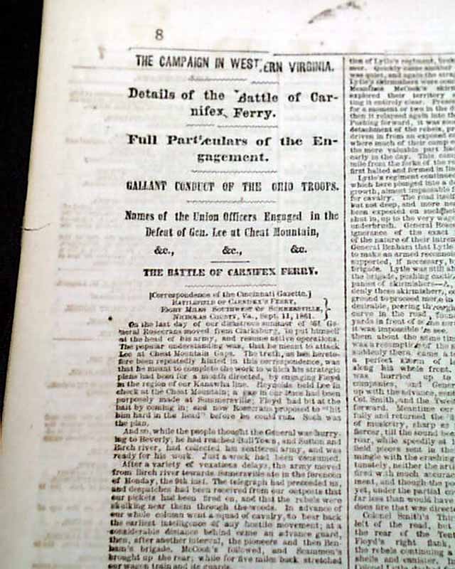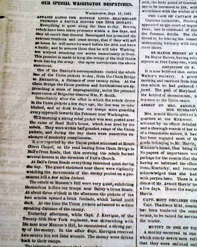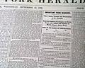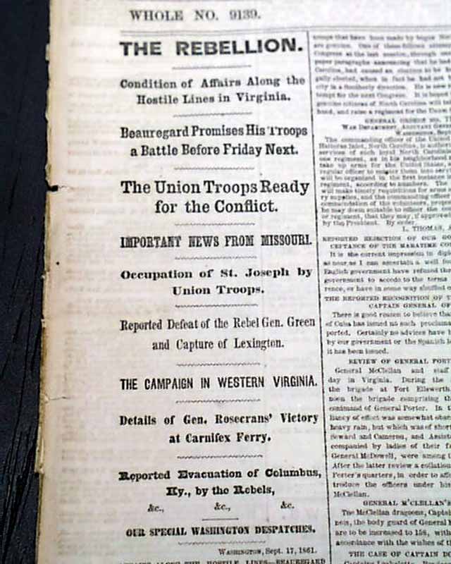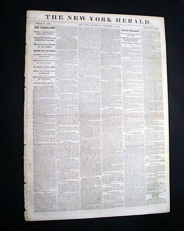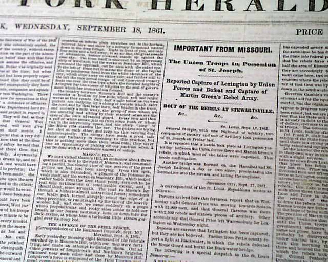 NEW YORK HERALD, Sept. 18, 1861  Among the front page column heads on the Civil War: "THE REBELLION" "Condition of Affairs Along the Hostile Lines in Virginia" "Important From Missouri" "Occupation of St. Joseph by Union Troops" "Details of Gen. Rosecrans' Victory at Carnifex Ferry" "Reported Evacuation of Columbus, Ky. by the Rebels" "Union Troops in Possession of St. Joseph" and more.