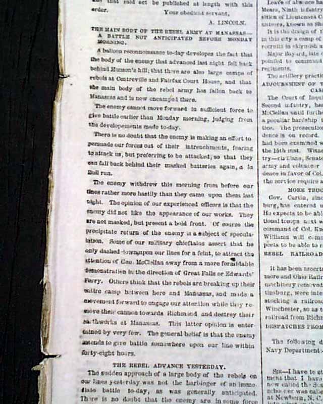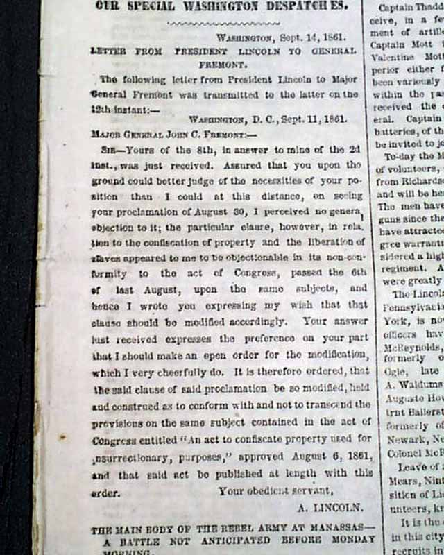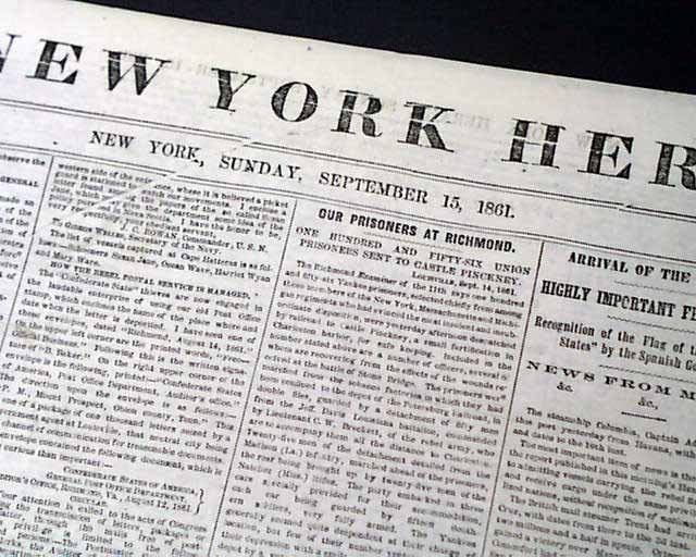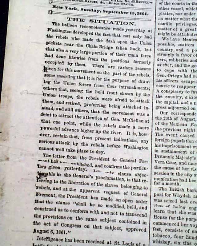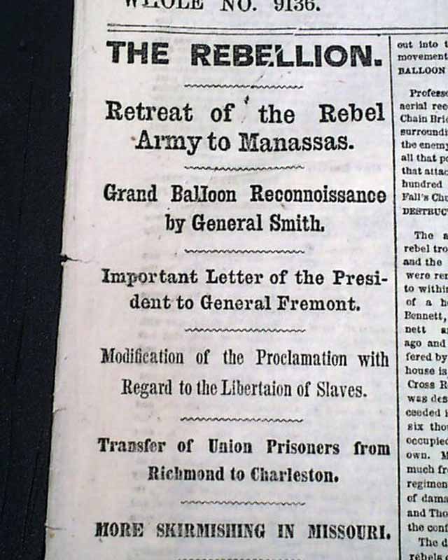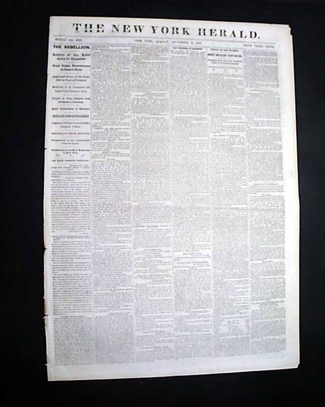 NEW YORK HERALD, Sept. 15, 1861 Among the front page column heads on the Civil War: "The Rebellion" "Retreat of the Rebel Army to Manassas" "Grand Balloon Reconnoissance by General Smith" "Important Letter of the President to General Fremont" "Modification of the Proclamation with Regard to the Liberation of the Slaves" "Transfer of Union Prisoners from Richmond to Charleston" "More Skirmishing In Missouri" & more.