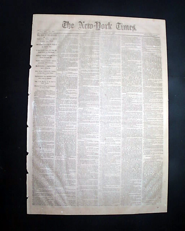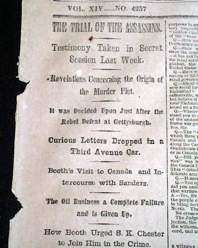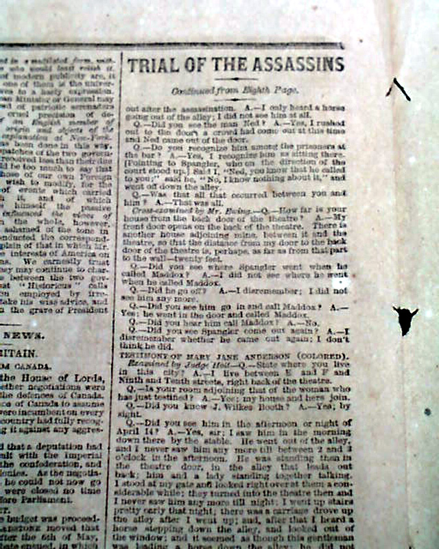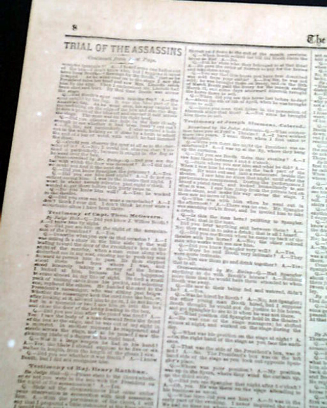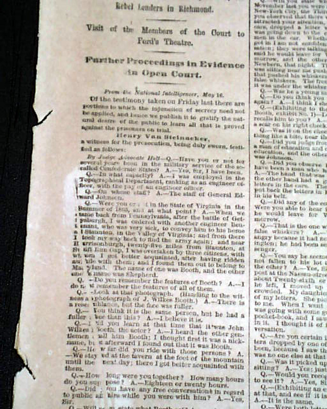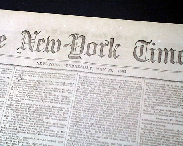 NEW YORK TIMES, May 17, 1865 Among the front page column heads are: "THE TRIAL OF THE ASSASSINS" "Testimony Taken in Secret Session Last Week" "Revelations Concerning the Origin of the Murder Plot" "It was Decided Upon Just After the Rebel Defeat at Gettysburg" "Booth's Visit to Canada & Intercourse with Sanders" "How Booth Urged S.K. Chester to Join Him in the Crime" "The Assassination Long Contemplated by the Rebel Leaders in Richmond" and more. This testimony takes the entire front page, most of page 8, half of page 4 & nearly half of page 5.