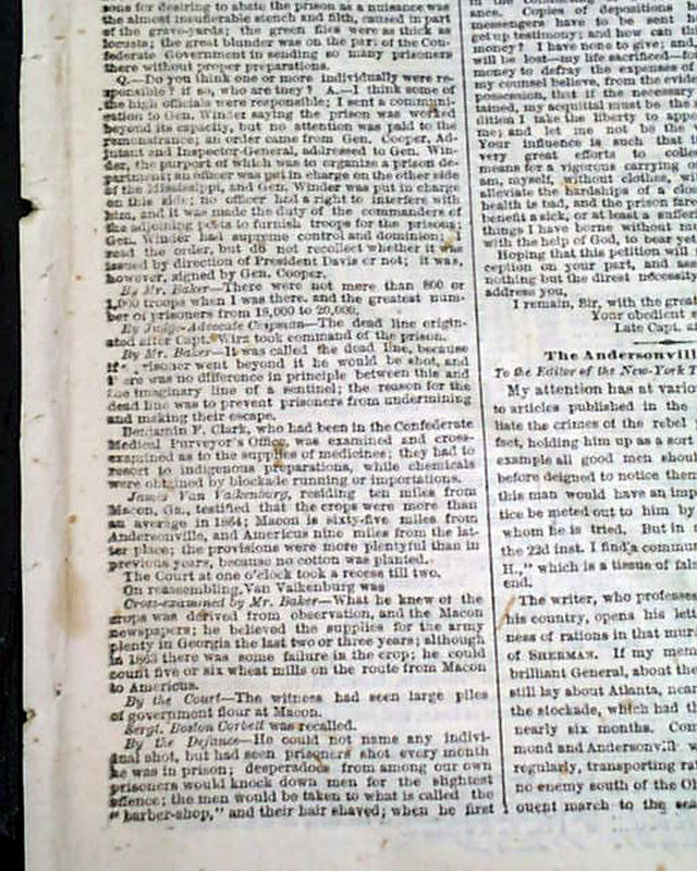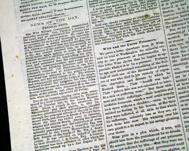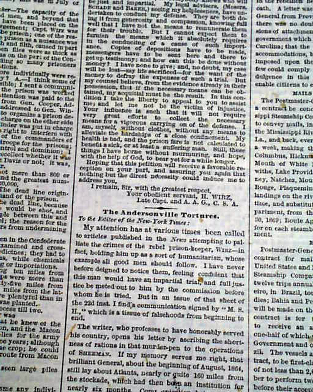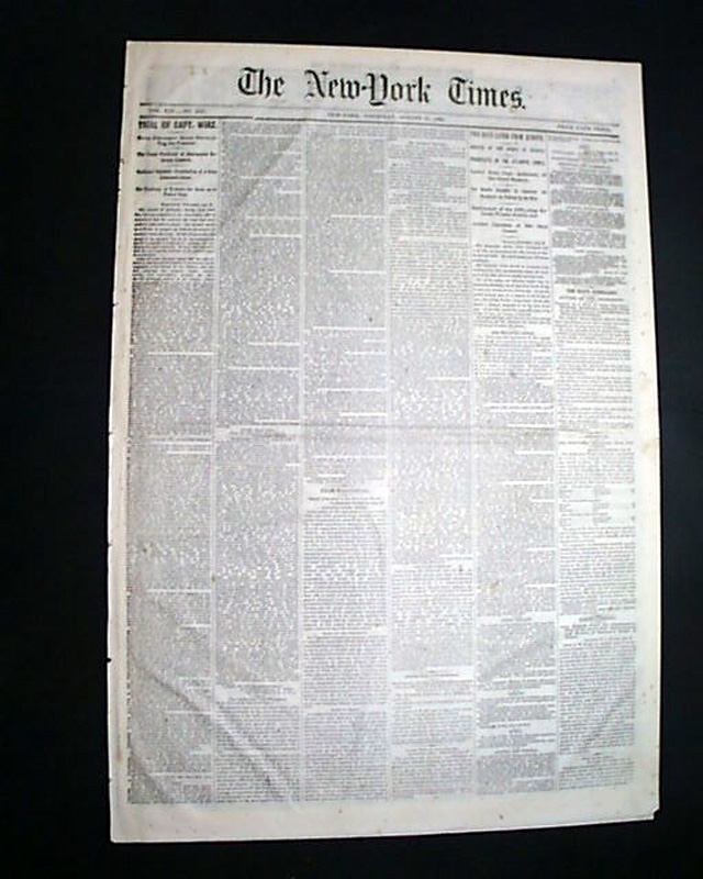 NEW YORK TIMES, Aug. 31, 1865  The front page has much on the trial of Captain Wirz. Wirz was a Confederate Army officer during the Civil War. He was the commandant of Andersonville Prison, a Confederate prisoner-of-war camp in Georgia where nearly 13,000 Union Army prisoners of war died as a result of inhumane conditions. After the war, Wirz was tried and executed for conspiracy and murder relating to his command of the camp.