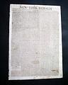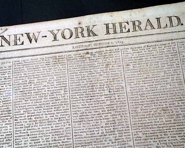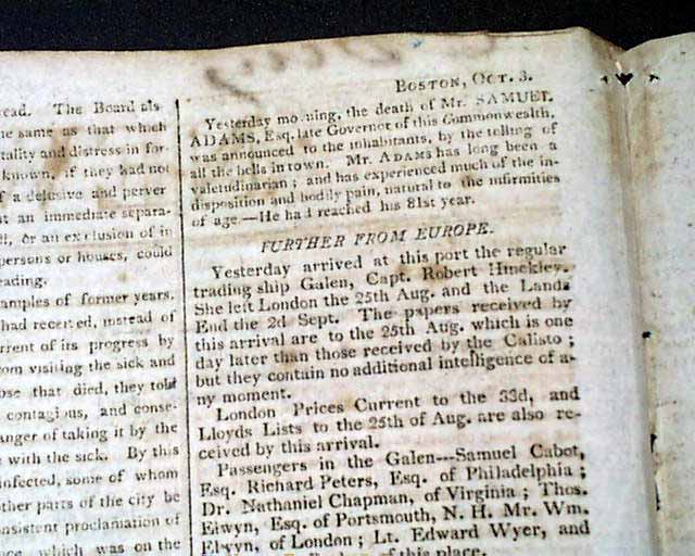 NEW YORK HERALD, Oct. 8, 1803  The top of page 2 has a rather unassuming article: "Yesterday morning the death of Mr. SAMUEL ADAMS, Esq. late Governor of this Commonwealth, was announced to the inhabitants by the tolling of all the bells in town. Mr. Adams has long been a valetudinarian; and has experienced much of the indisposition and bodily pain natural to the infirmities of age. He had reached his 81st year."